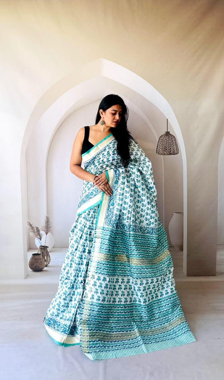 - Featuring exquisite hand block prints from Bagru, Jaipur on the pallu(drape)