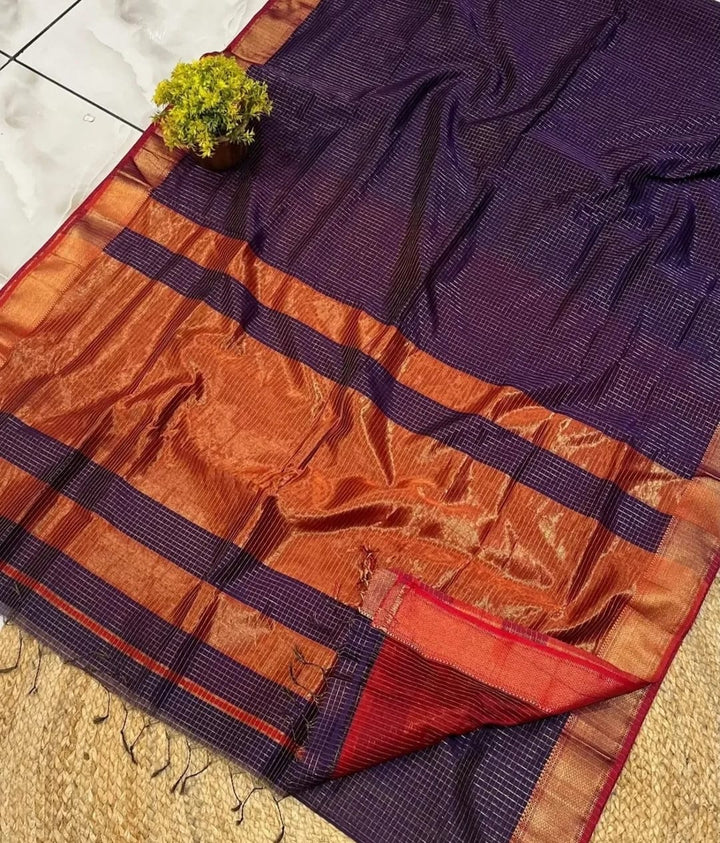 Premium maheshwari Zari Check saree handwomen by our karigars in Maheshwar. each saree comes with blouse running with similar border.