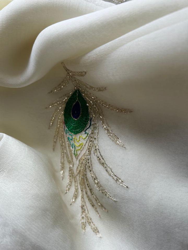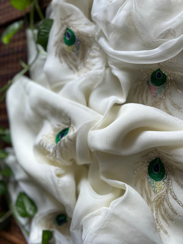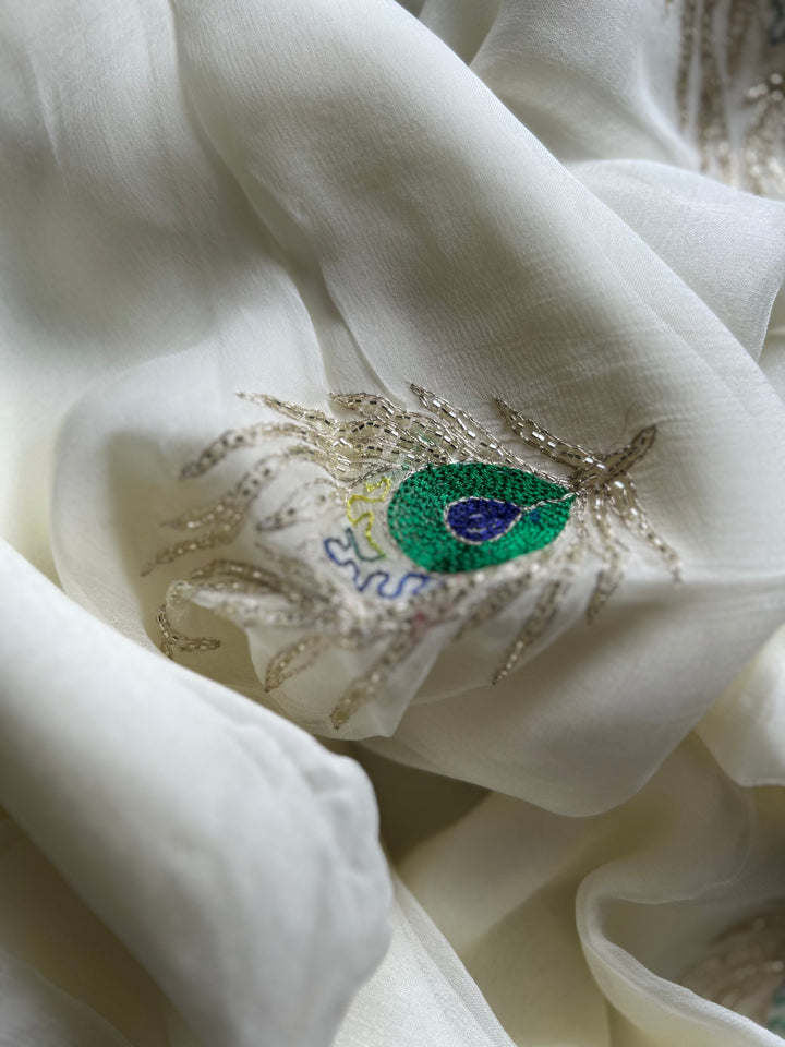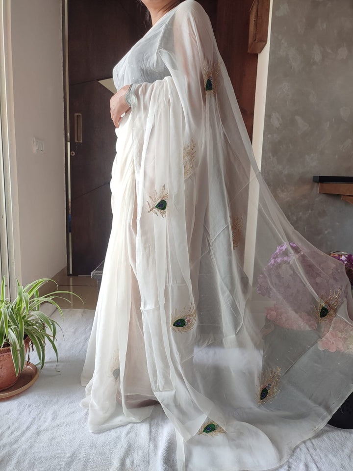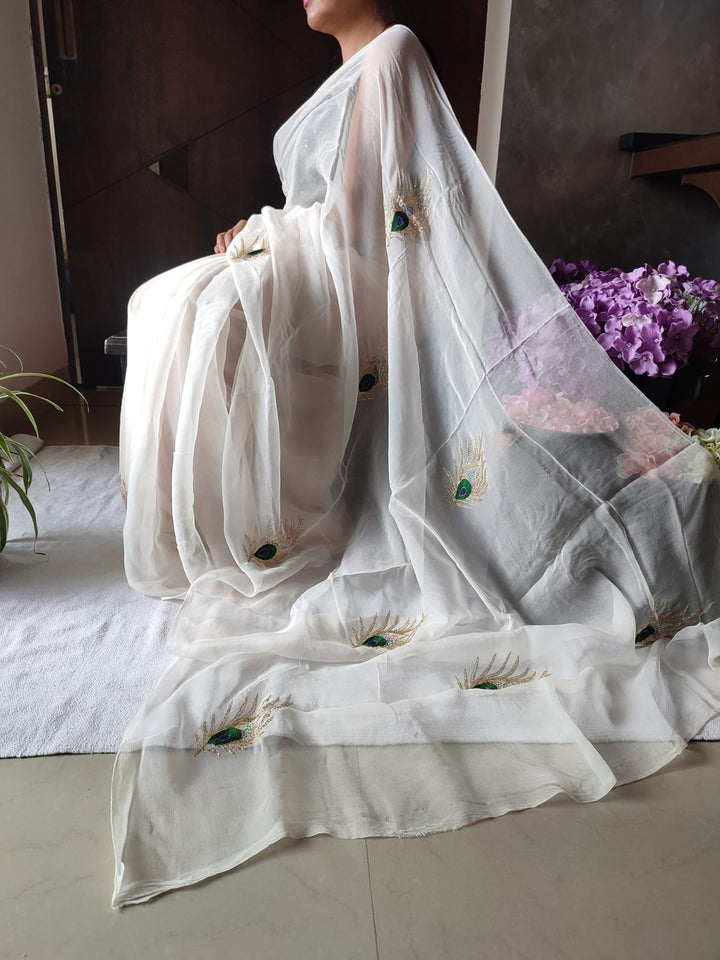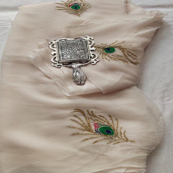 Eleganat Pure Rajputi Chiffon Saree In Cream Color, With Sequin Work All Over The Saree. The Hand Work On This Pure Chiffon Saree Makes It Look Delicate As Well As Perfect For Any Occasion.