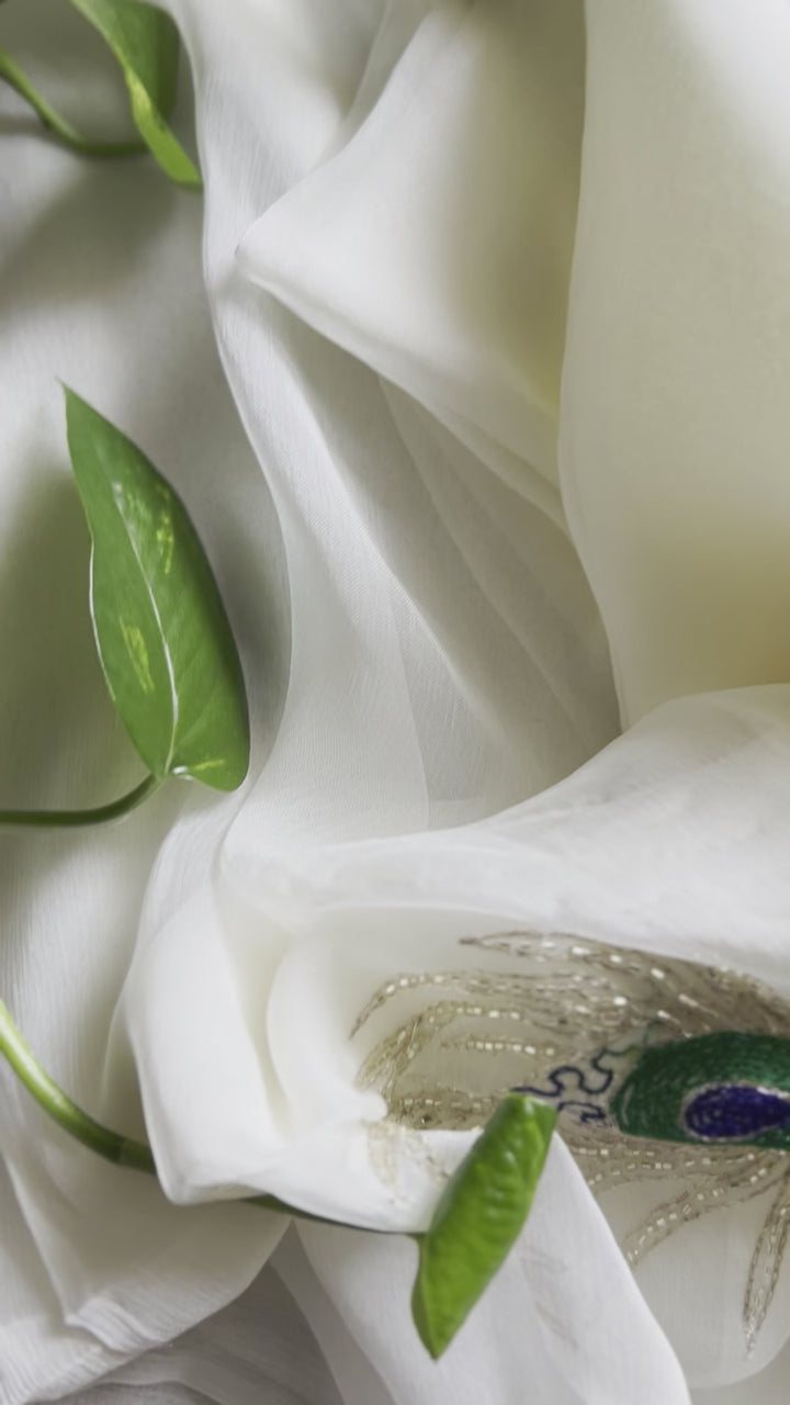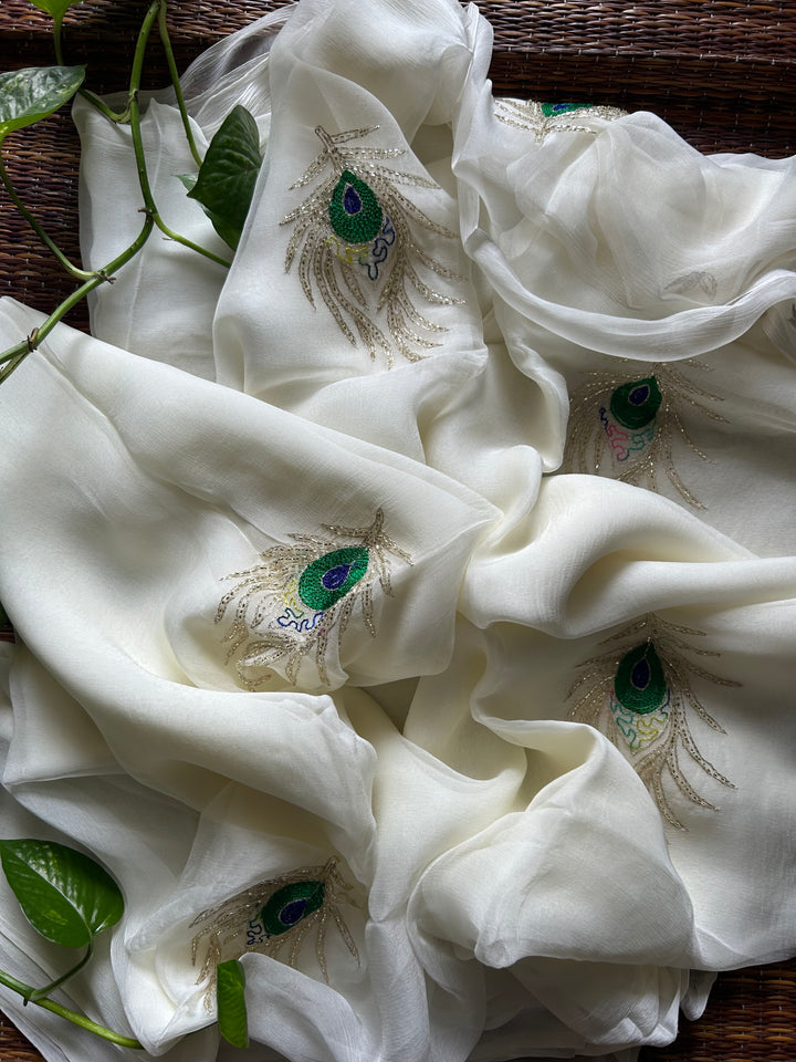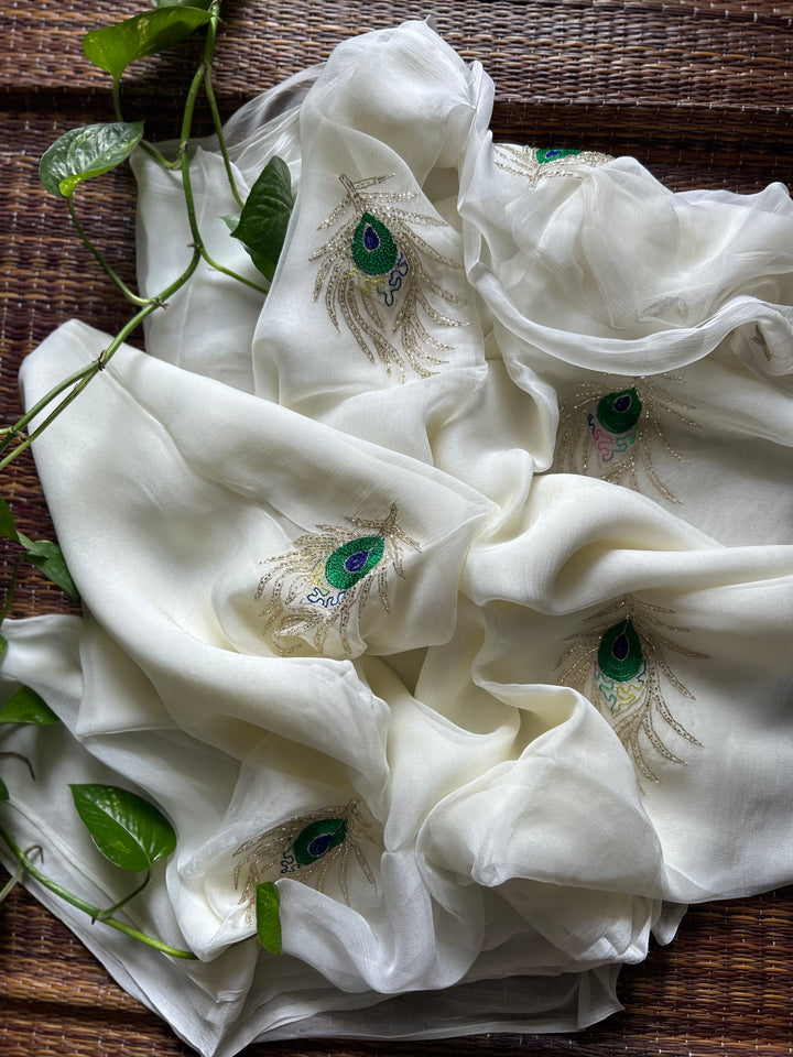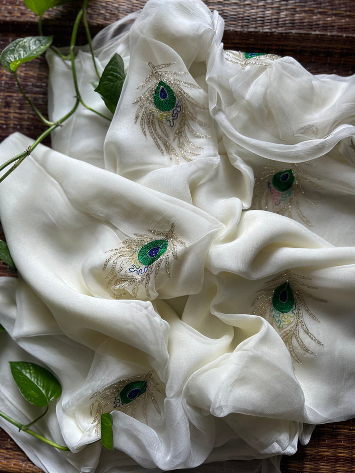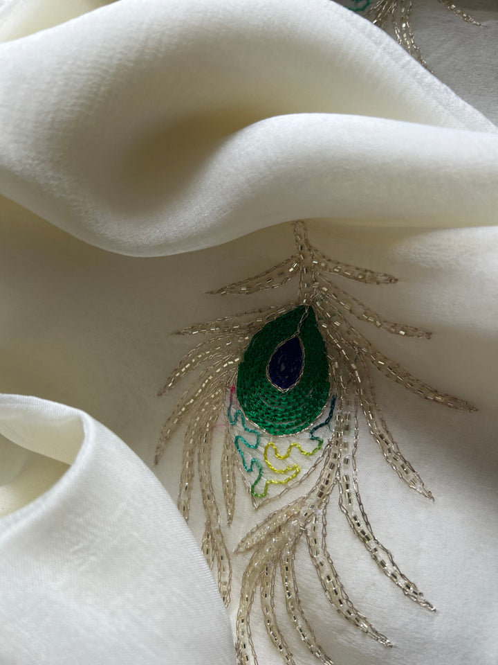 Eleganat Pure Rajputi Chiffon Saree In Cream Color, With Sequin Work All Over The Saree. The Hand Work On This Pure Chiffon Saree Makes It Look Delicate As Well As Perfect For Any Occasion.