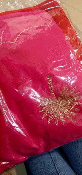 On hand embroidred sarees and suits there may be little variations in Colour or Embroidery due to hand dyed the hand embroiderd process of making each product unique and hence the shade tone may vary by 3-5% .