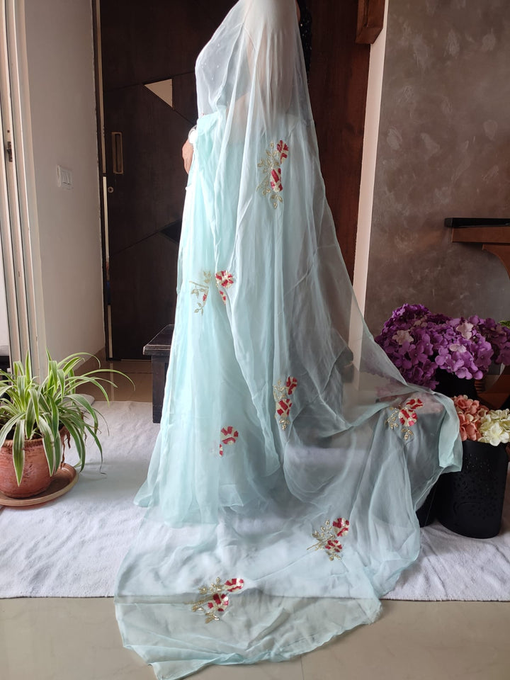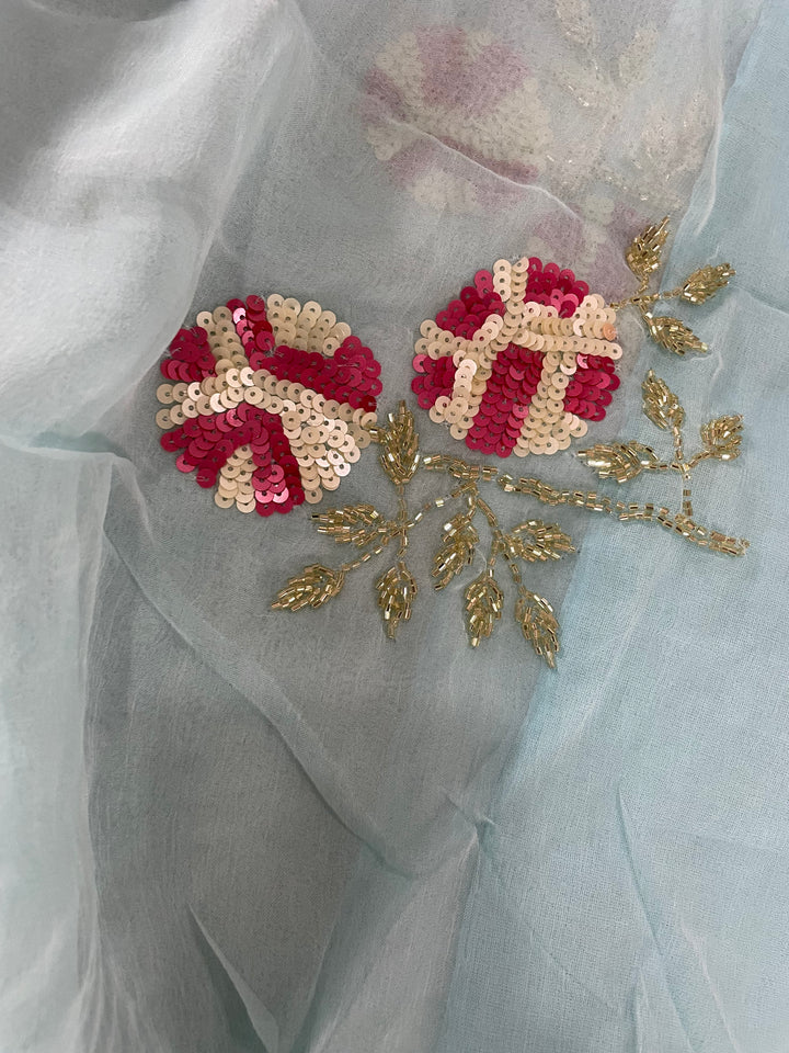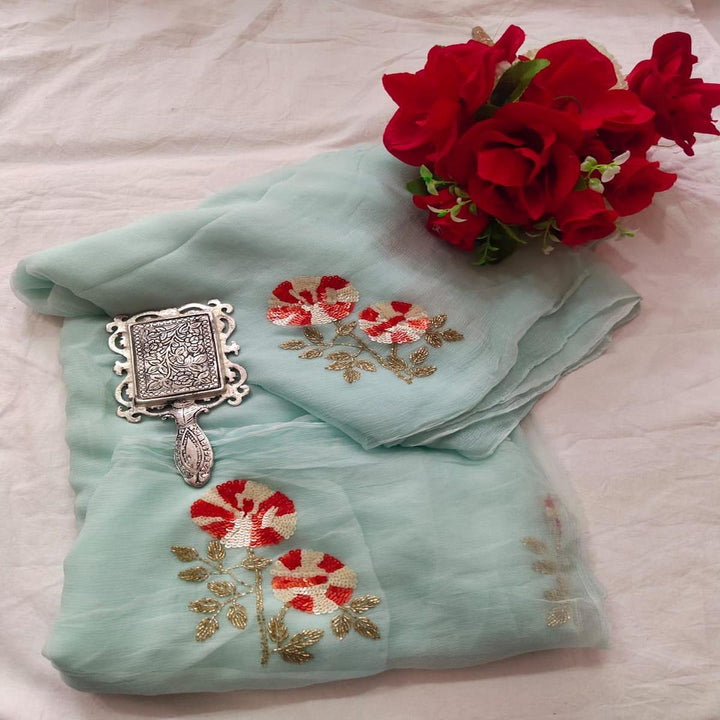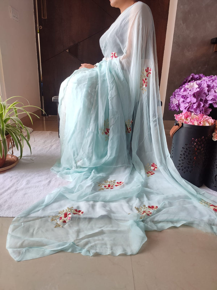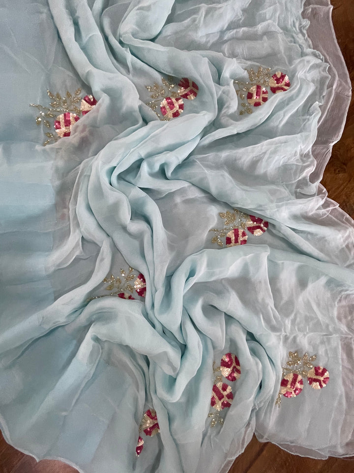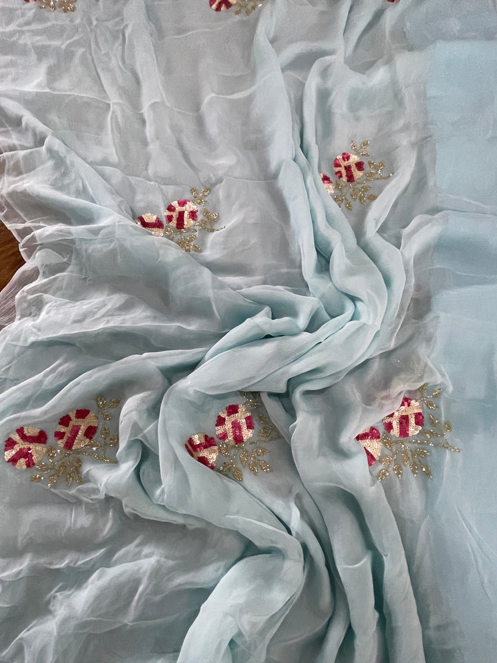 This Alluring Chiffon Saree is Adorned With Beautiful Handwork Motifs All Over And Is Paired With An Elegant Matching Unstitched Blouse Which Be Custom Designed As Per Your Style.