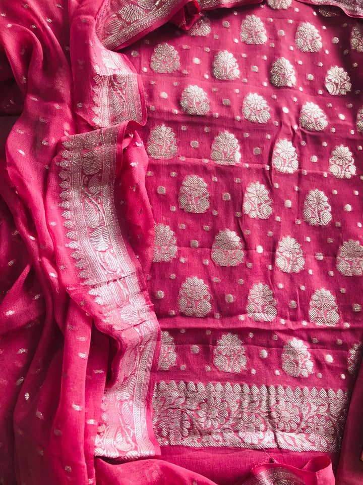 Unstitched Pure Banarasi Khaddi Georgette Suits In hot pink With Gorgeous Boota on Full Suit With Designer Similar Border Dupatta and pure crepe bottom . shop authentic banarasi georgette salwar suit online.