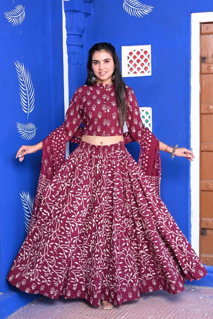 Maroon Bagru Hand Block Printed Designer Top & Skirt With Mulmul Dupatta.