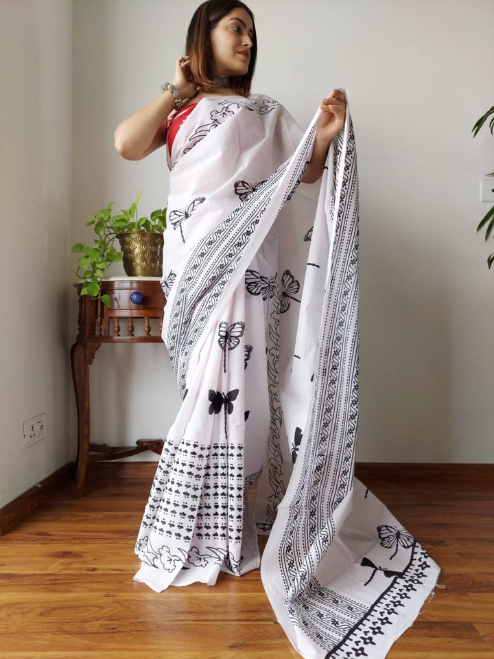 This White Classic̴Ì?̴Ì?cotton Saree is made bagru with block print craft, features printed motifs all over and a slender look. This saree comes with an attached blouse piece which you can customize to your liking. Team this saree with heels and fine jewellery to create a trendy look.
