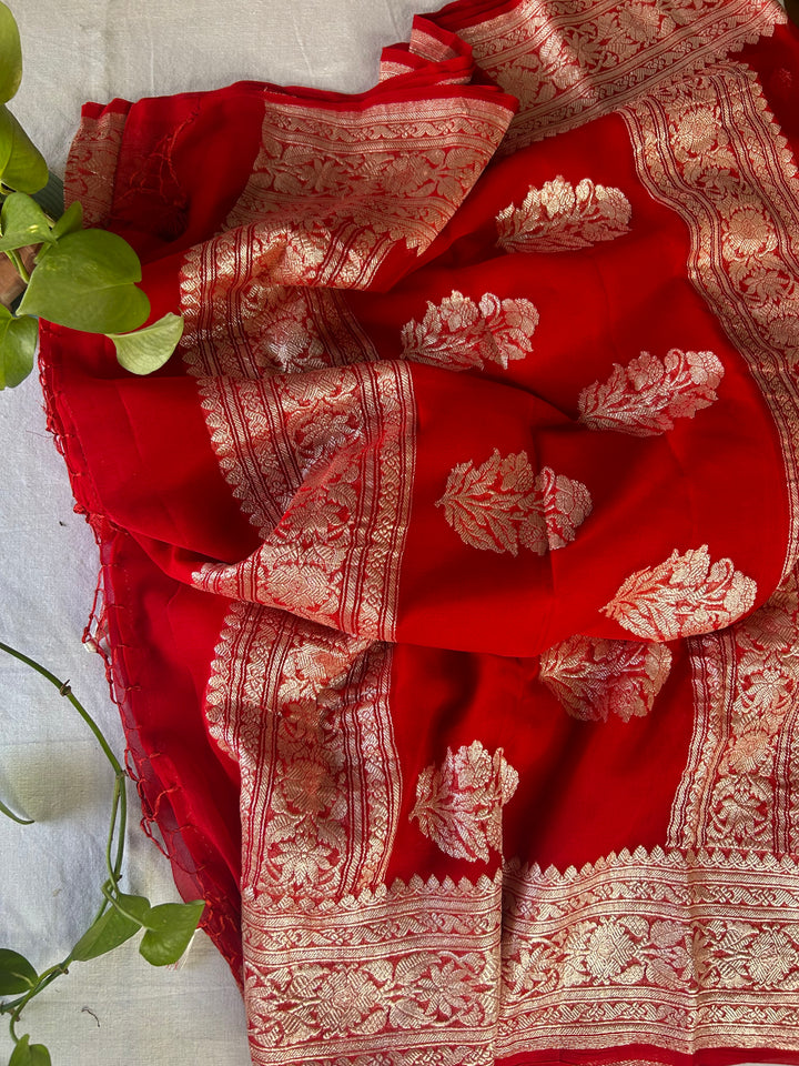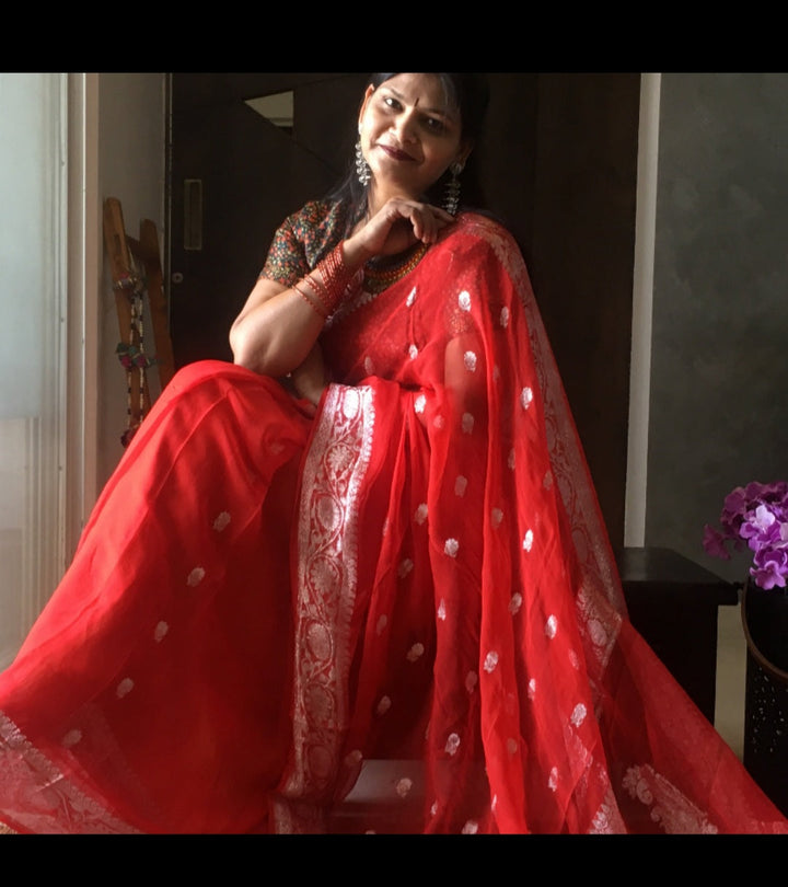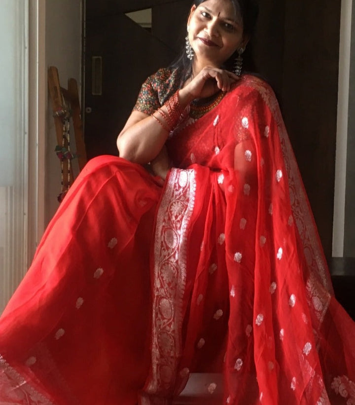 - Designer Royal Red Jaal Pure Banarasi Khaddi Georgette Saree