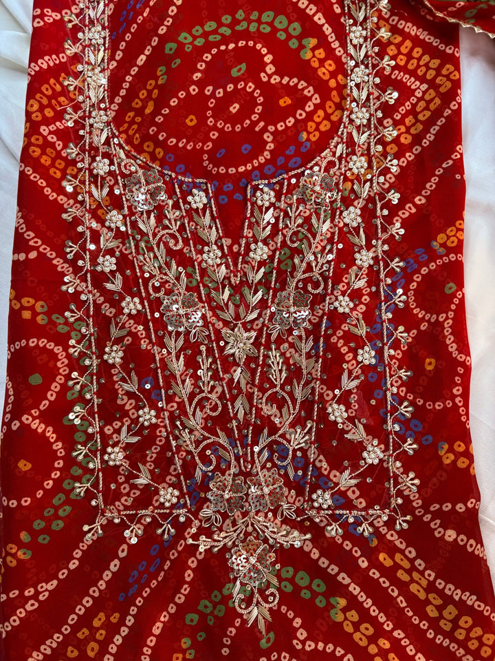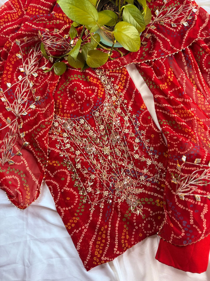 Red Bandhej Gota Patti Suit in Georgette With Designer Dupatta,This Three Piece Salwar Suit Comes With Matching Bottom Of Dupatta Color, Each Fabric Is 2.5 Mtr Long.