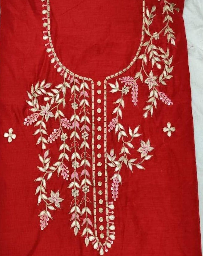 A beautiful chanderi based Gota Patti kurta with nice shade, is adorned with gota work on yoke. Wear this one with our palazzo or skirt along with our banarsi dupatta for a complete look. You may also want to match it with our Chikankari pantsFabric Length - 2.5 Mtr full length kurti unstitched material