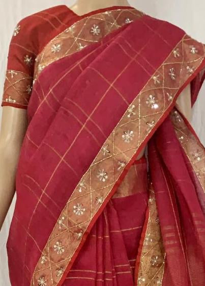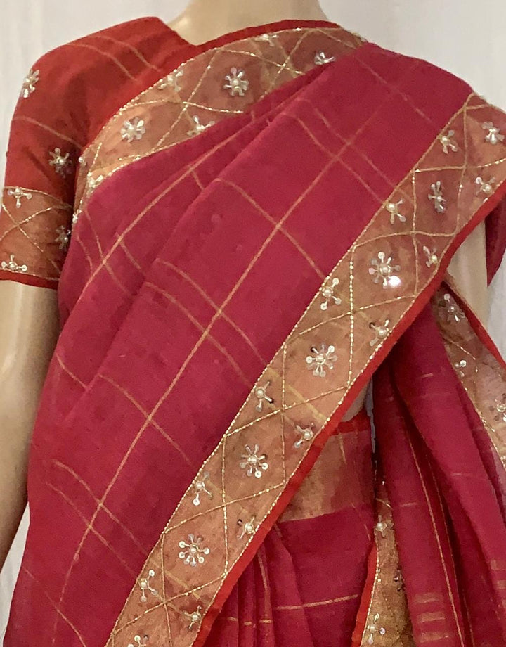 This red Linen Embroidered Saree By Jhakhas Is A Absolute Bliss To Wear. This Linen Saree Is 6.5 Meter Long And Comes With A Unstiched Contrast Blouse Piece. The Handloom Saree Has A Silver Border All Over And Matching Tassels On The Pallu Which Gives It A Stylish Look. Absolutely Perfect For Summer Season.