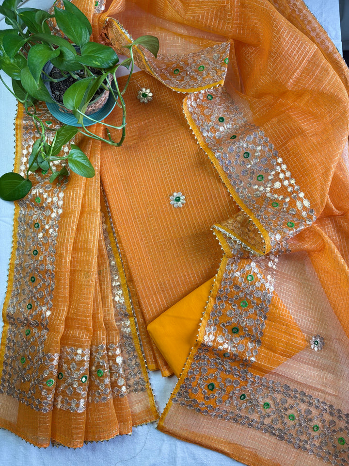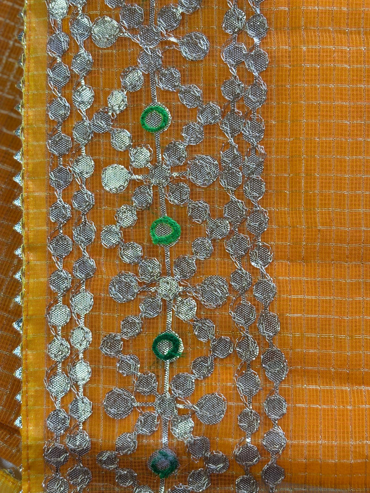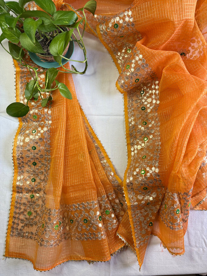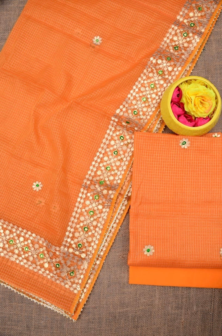 Rupam- Kota Salwar Suit In Gota Work In Orange , This Traditional Suits 2.5 Mtr Top In Kota ,2.5 Mtr Dupatta In Kota,2.5 Mtr Bottom In Cotton, Wear This Kota Doria Suit With Kundan Necklace And Jhumkas On Day Time Function, This Designer Suit Comes With Beautiful Dupatta That Seems Perfect For Any Occasion,Free Shipping And Cod Available, Shipping Worldwide.