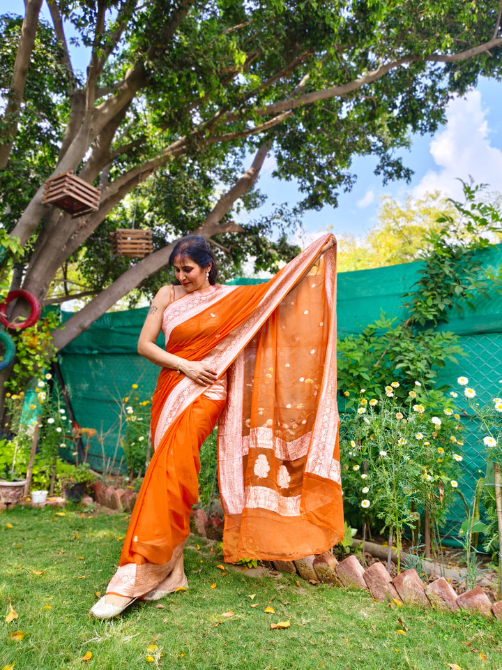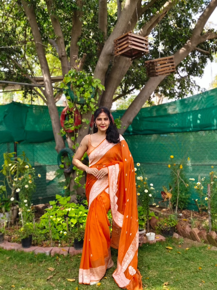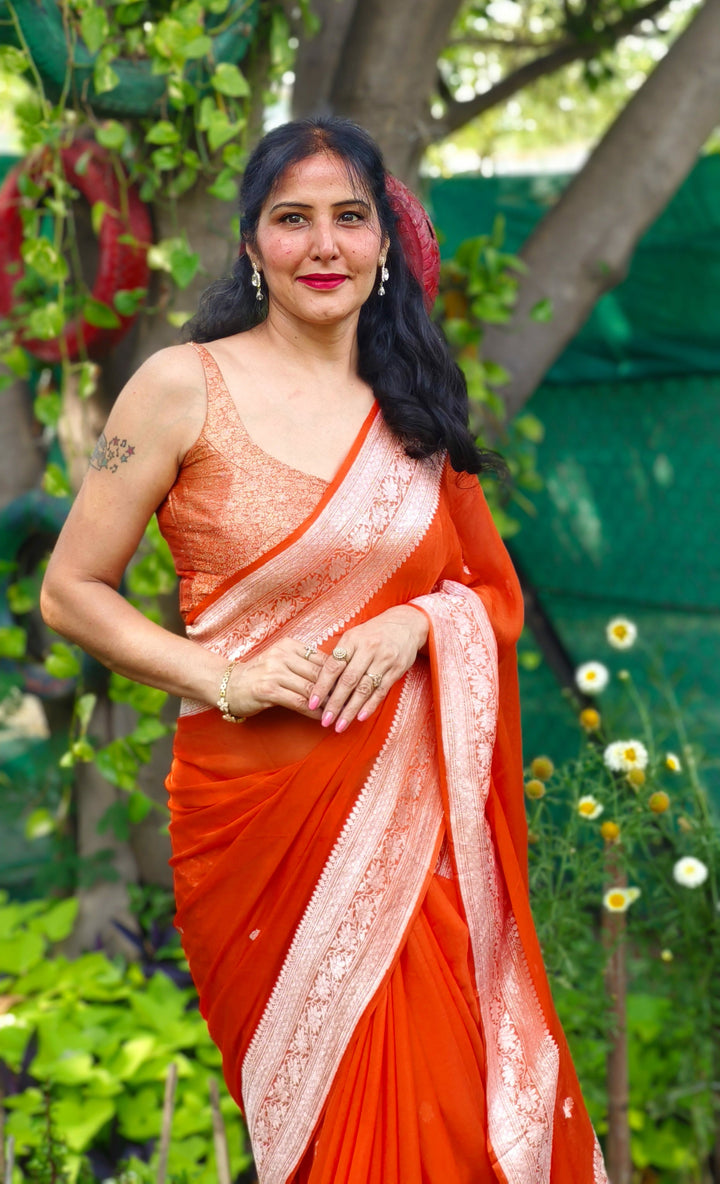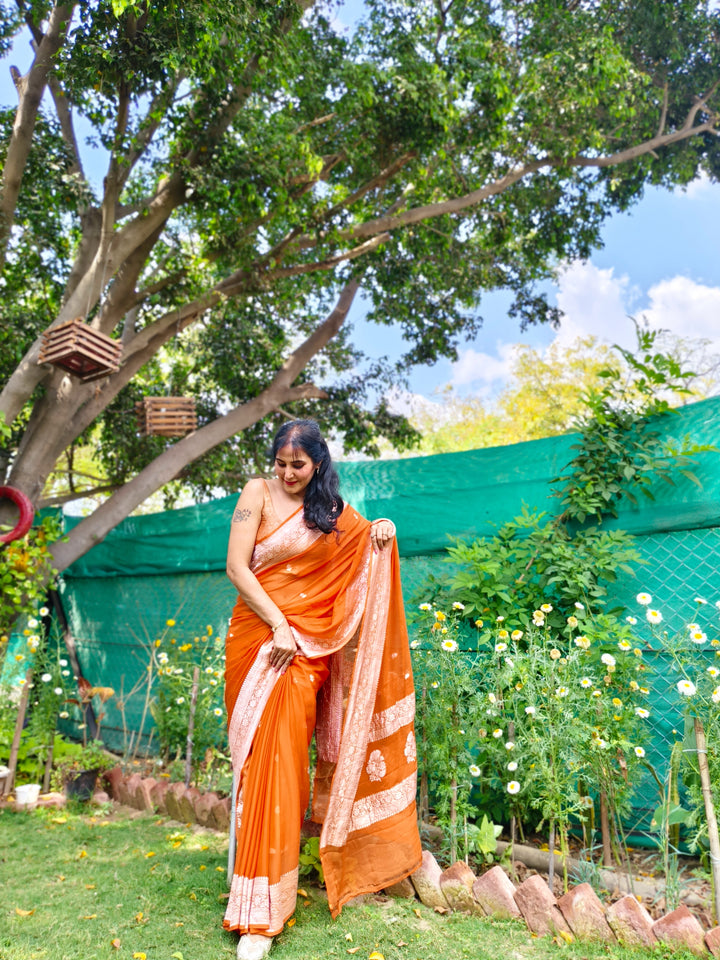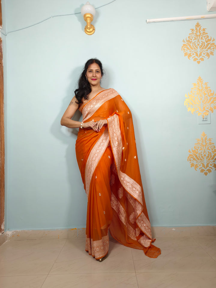 - Designer Orange Pure Banarasi Khaddi Georgette Saree