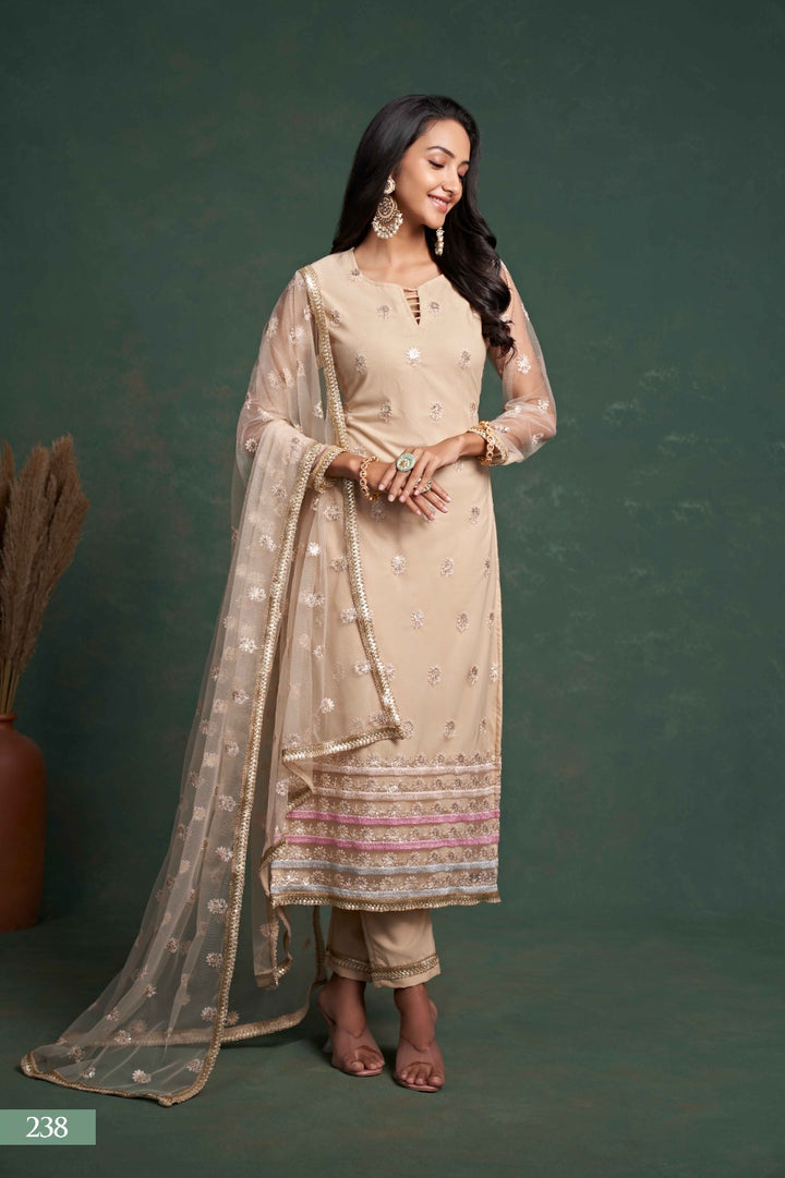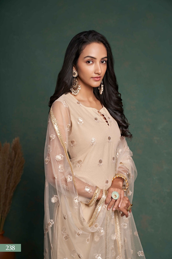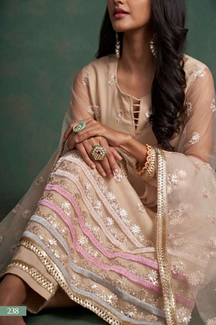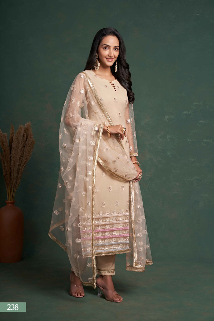Sequins Suit Set with Embroidery Work in Cream [Semi-Stitched]