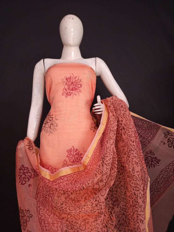 Attractive Kota Doria Hand Block Print Suit In Light Orange This Traditional Suits 2.5 Mtr Top In Kota ,2.5 Mtr Dupatta In Kota,2.5 Mtr Bottom In Cotton, Wear This Kota Doria Suit With Kundan Necklace And Jhumkas On Day Time Function, This Designer Suit Comes With Beautiful Dupatta That Seems Perfect For Any Occasion,Free Shipping And Cod Available, Shipping Worldwide.