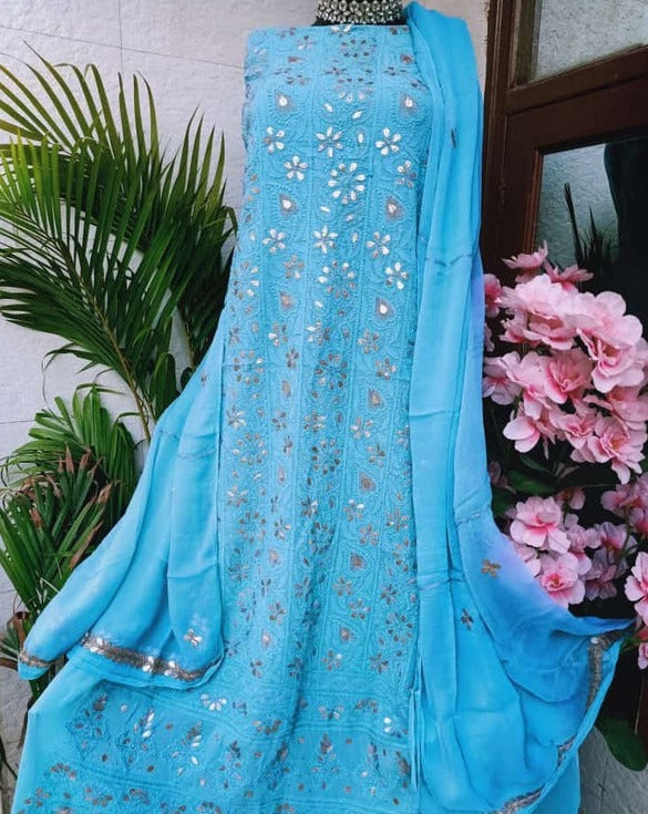 - “Asmani Nazaara” Sky Blue Lucknowi Chinkari Gota Patti Salwar Suit Fabric