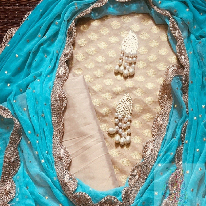 Sky Blue Desiger Dupatta With Chanderi Silk Topembroidered Dress Material, Heavy Gota Patti Suits. Every Suit Is 2.5Mtr Top Length And 2.5 Mtr Bottom And 2.5 Mtr Dupatta Length, Shop Exclusive Collection Of Designer Salwar Suit At Jhakhas.Com. Free Shipping And Cod Available, Shipping Worldwide.
