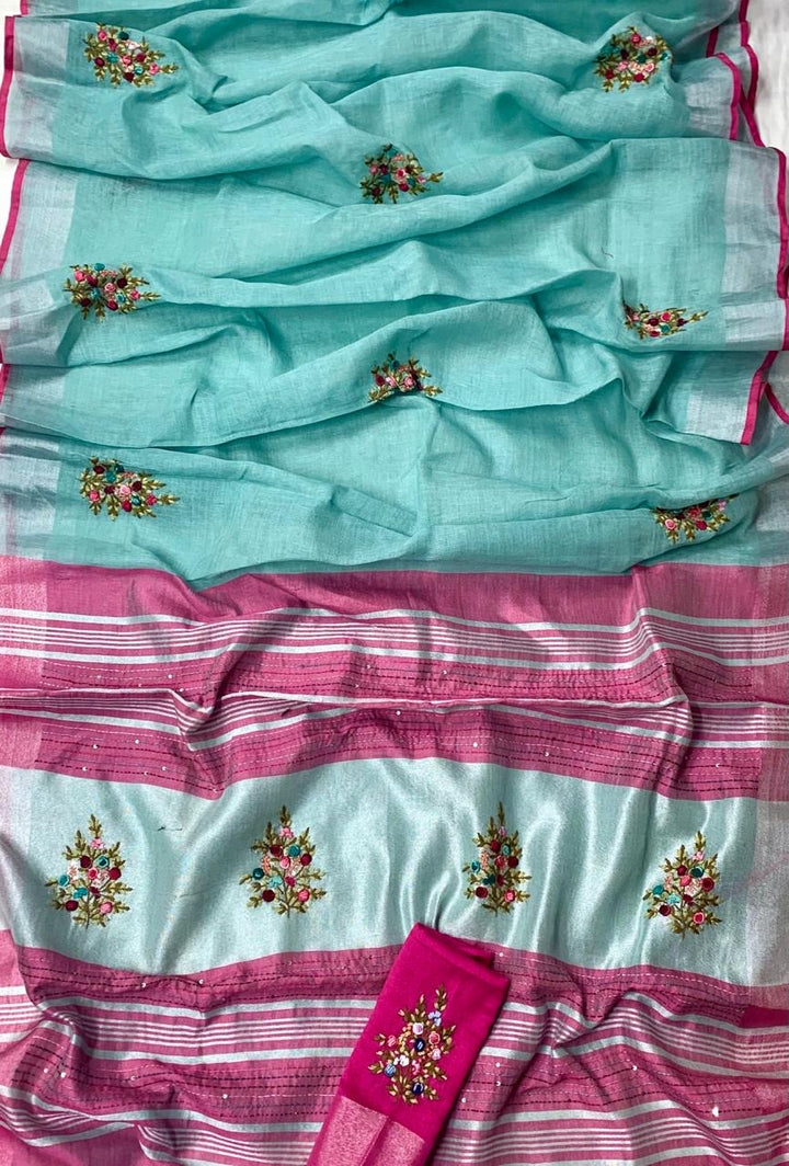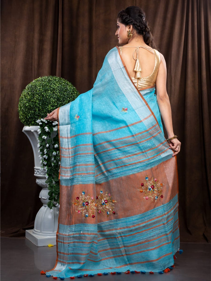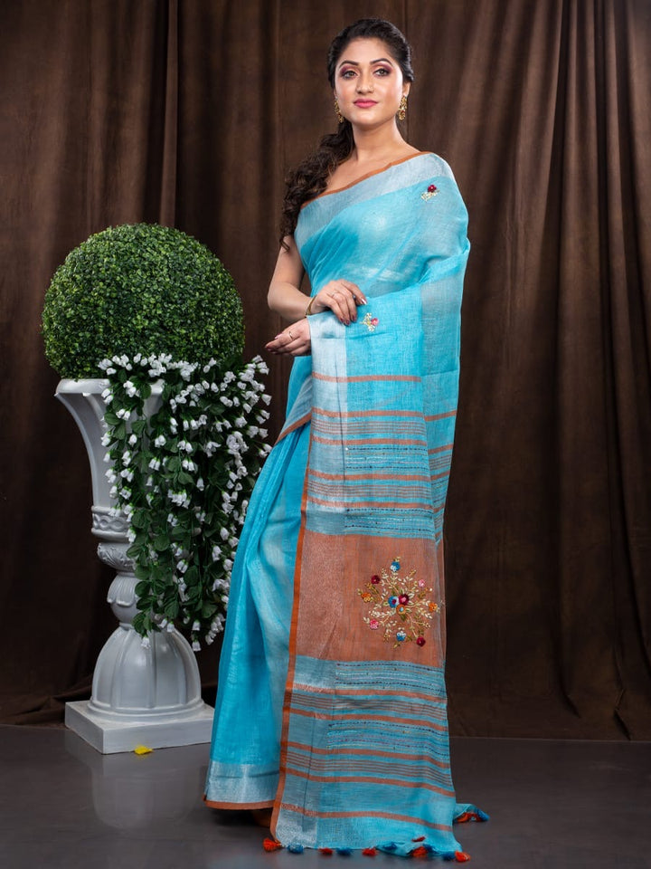 Pure Linen Embroidered Saree Is Crafted In Linen And Features Beautiful Hand Embroidery And Tassel Details .