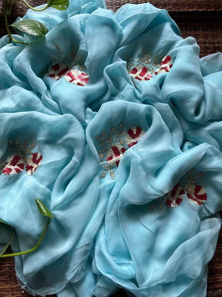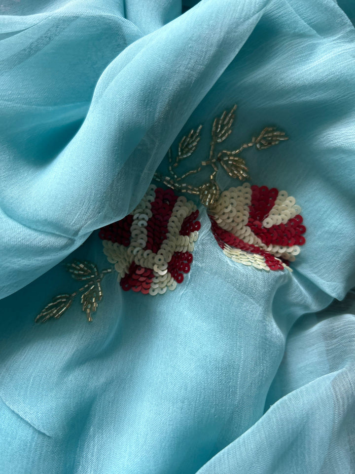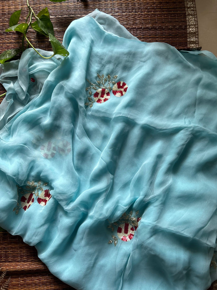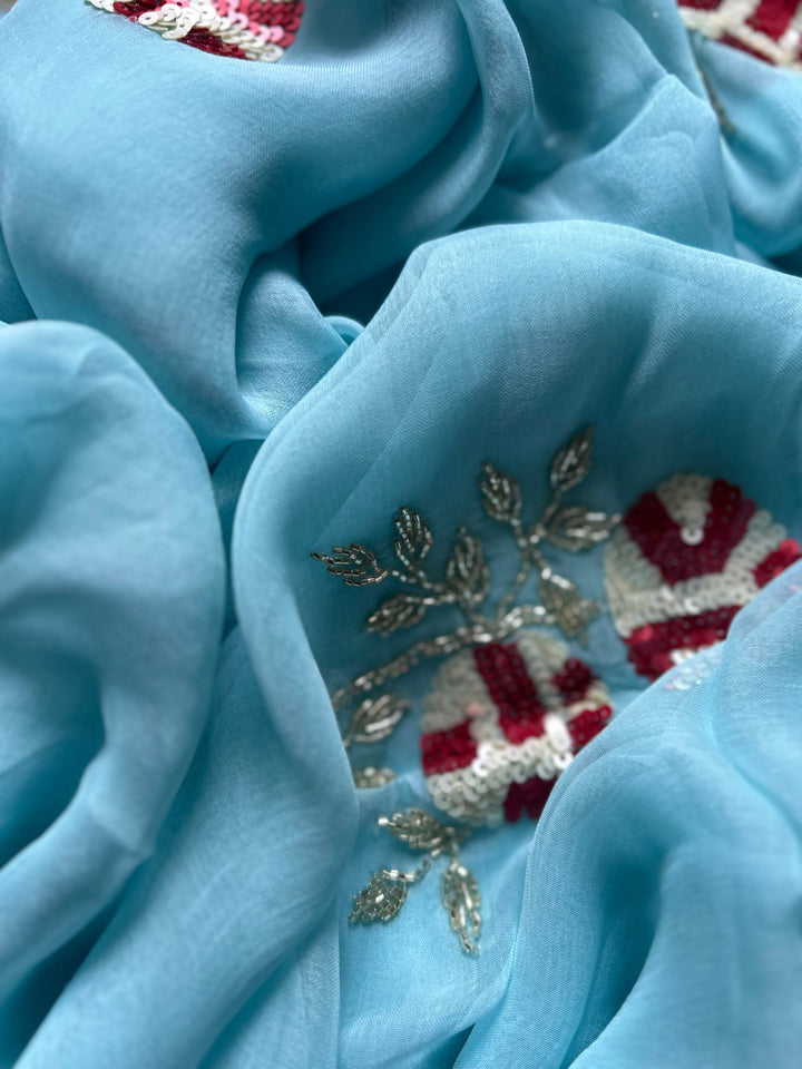 This Alluring sky blue Chiffon Saree is Adorned With Beautiful Handwork Motifs All Over And Is Paired With An Elegant. Matching Unstitched Blouse Which Be Custom Designed As Per Your Style.