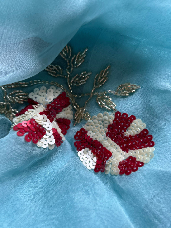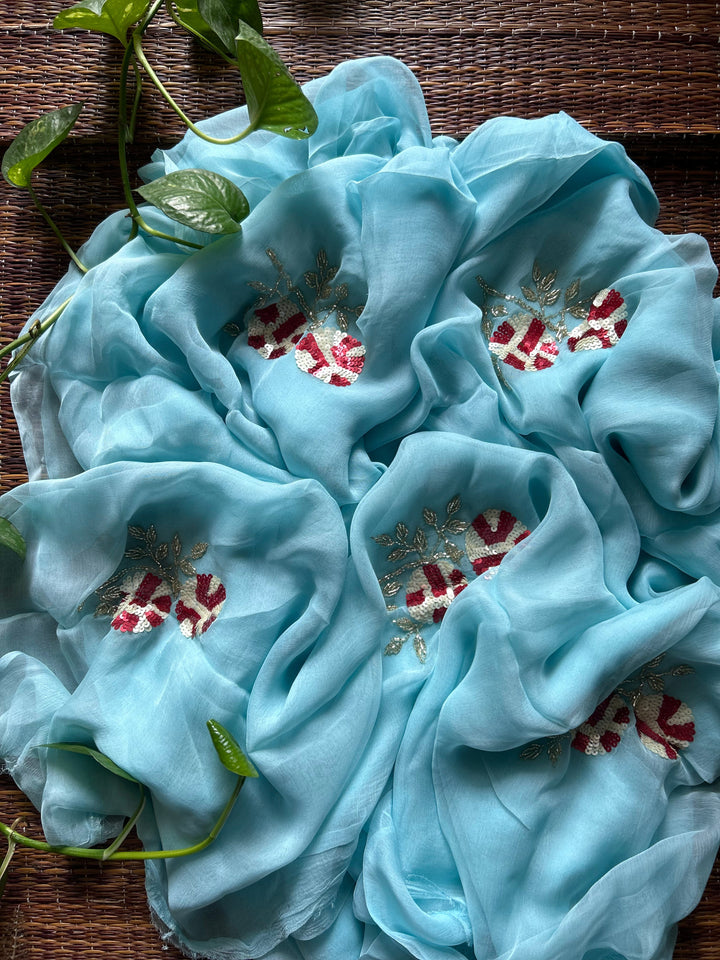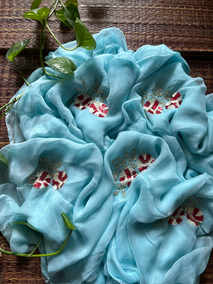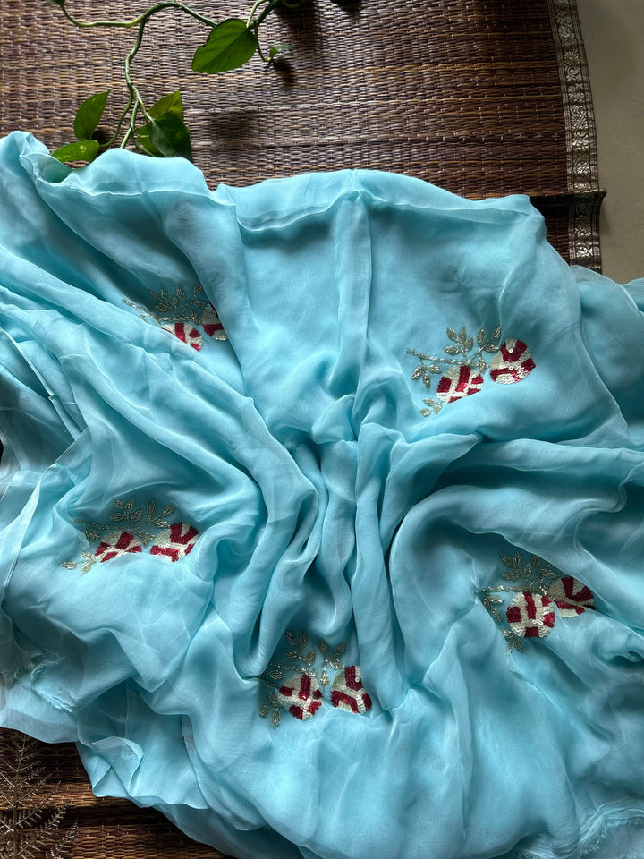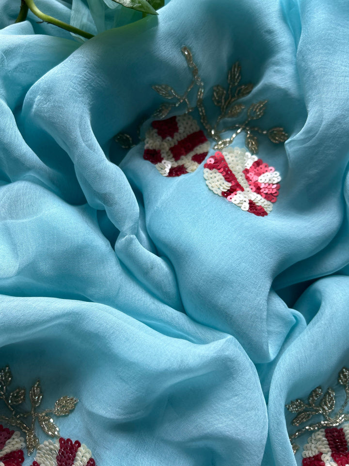 This Alluring sky blue Chiffon Saree is Adorned With Beautiful Handwork Motifs All Over And Is Paired With An Elegant. Matching Unstitched Blouse Which Be Custom Designed As Per Your Style.