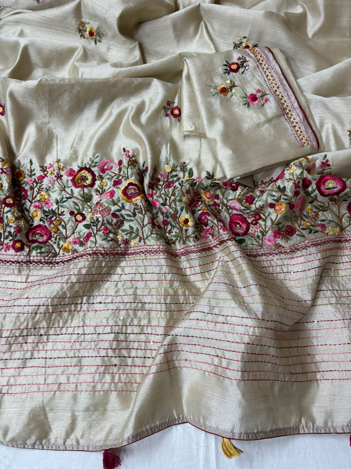 Off White Soft Silk hand embroidered Saree