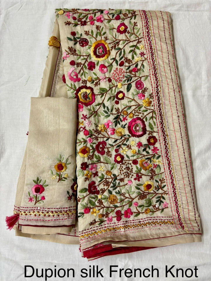 Dupion Silk With French Knot hand embroidery made in West Bengal, The fabric very soft and smooth & body friendly saree with blouse piece.