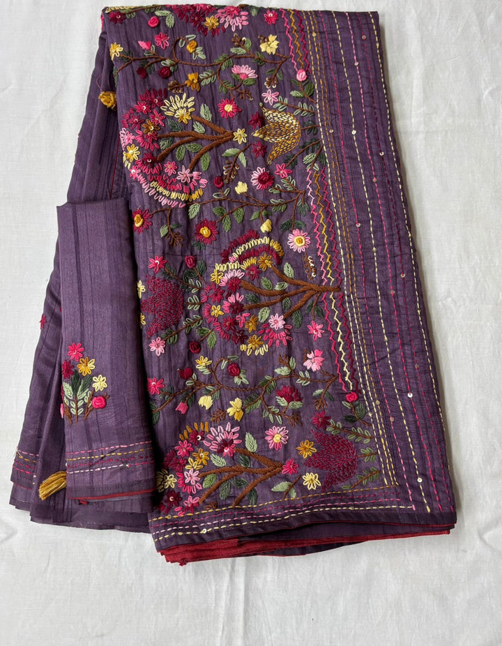 Dupion Silk With French Knot hand embroidery made in West Bengal, The fabric very soft and smooth & body friendly saree with blouse piece.