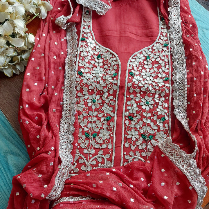 Stylish Rust Red Gotawork Salwar Suitunstitched Salwar Materials,Designer Salwar Suits Online. Every Suit Is 2.5Mtr Top Length And 2.5 Mtr Bottom And 2.5 Mtr Dupatta Length, Shop Exclusive Collection Of Designer Salwar Suit At Jhakhas.Com. Free Shipping And Cod Available, Shipping Worldwide.