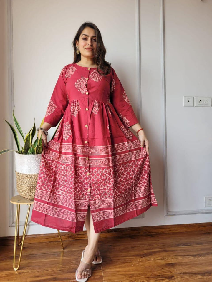 Our Bagru dress is Hand crafted On Cotton Fabric Is a Must Buy For Summer Season. It has Round Neck with Elbow Sleeves And Frill Design in Bottom. This Beautiful Cotton Dress Is A Perfect For Day Outing, Brunches, or picnic. The Length Of the Dress is 45inchs.