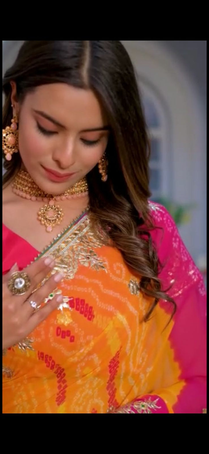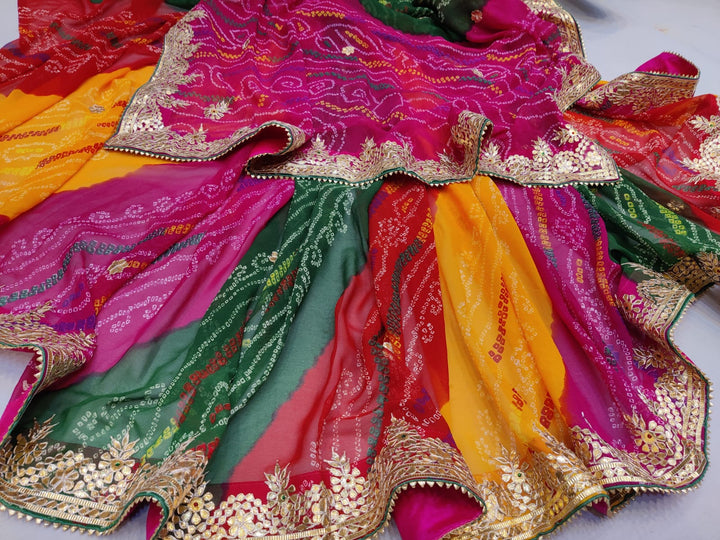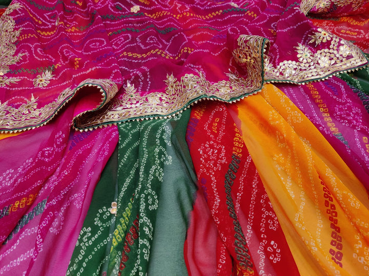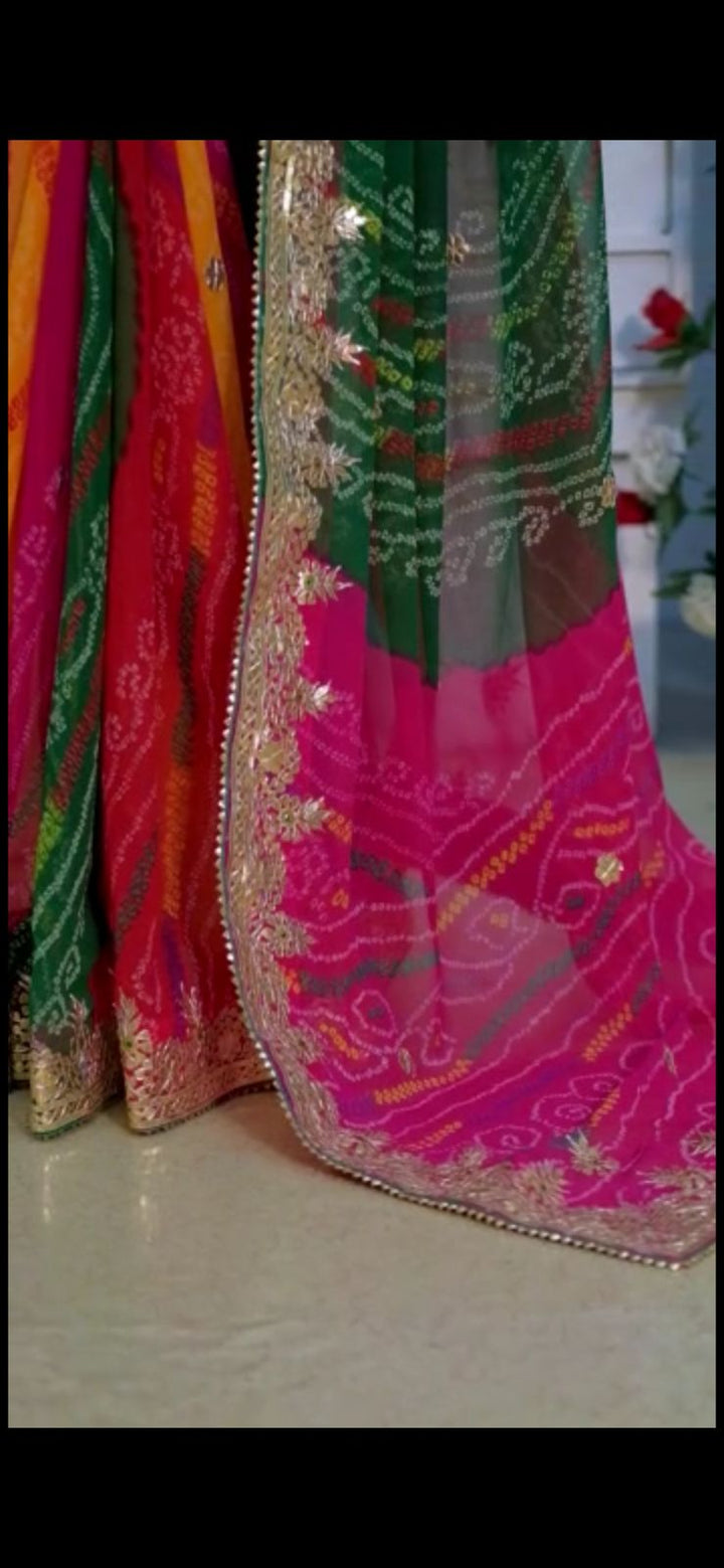 (This saree will be delivered in 8-10 days on Made on Order) Traditional multicolor Bandhej Sarees With Handwork In Red.This Fancy Bandhej georgette Saree Is Full multicolor Bandhani With Hand Gota Patti Work As Shown In Picture. Full backing lappa Hand Work In Whole Saree with pure upada fabric gota work blouse.