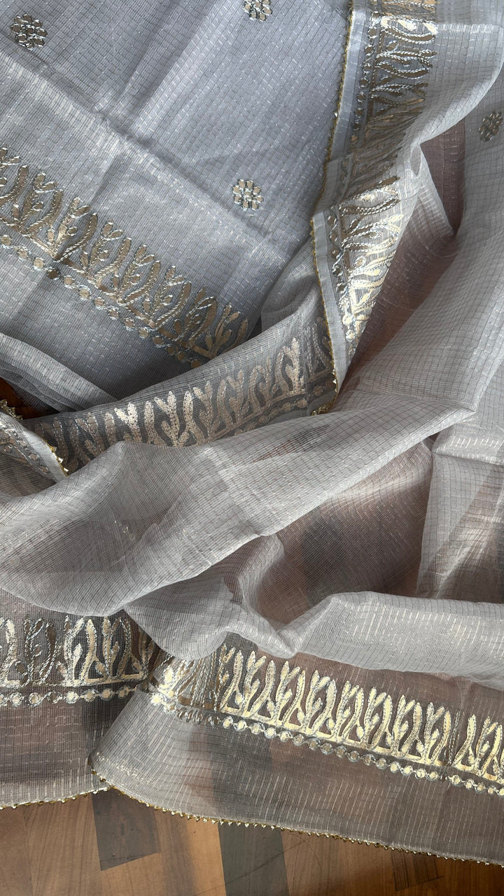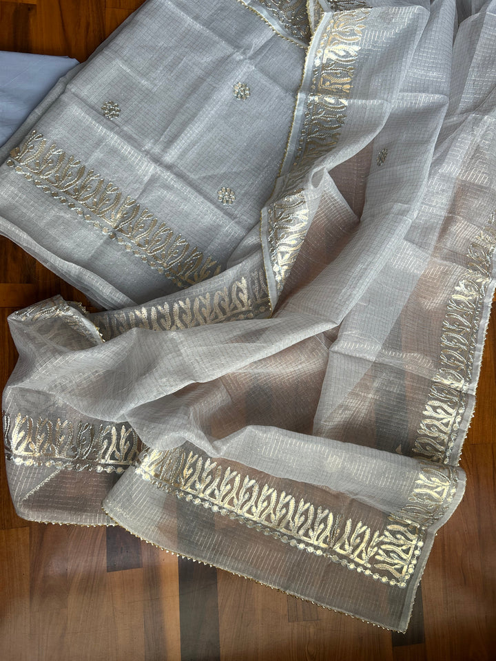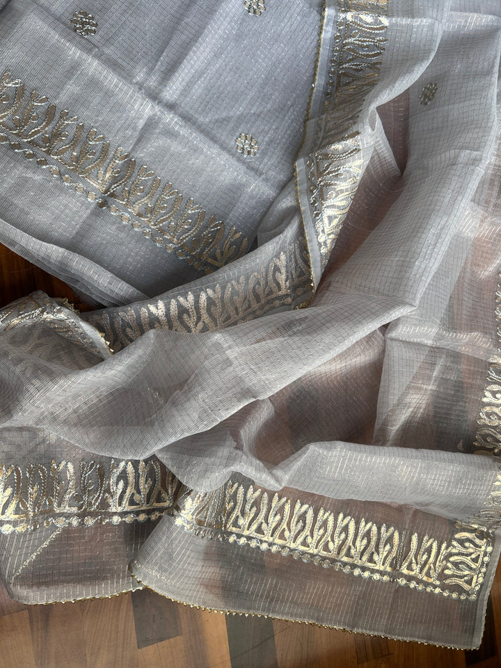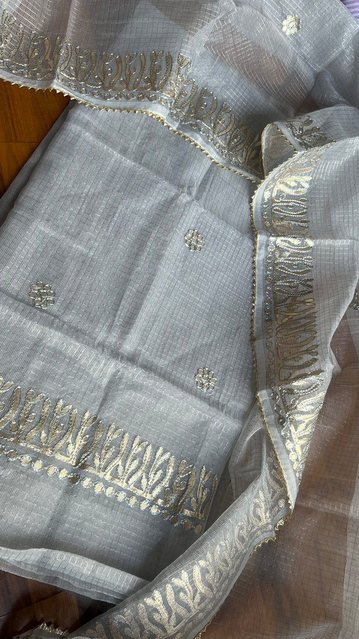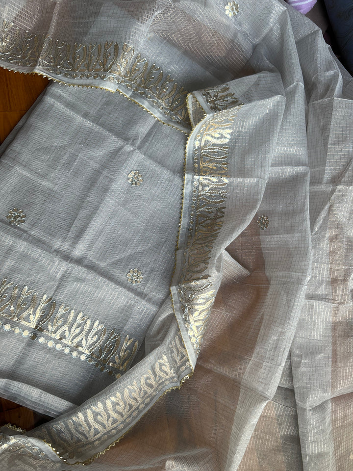 Tejkanwar- Kota Salwar Suit In Gota Work In grey This Traditional Suits 2.5 Mtr Top In Kota ,2.5 Mtr Dupatta In Kota,2.5 Mtr Bottom In Cotton, Wear This Kota Doria Suit With Kundan Necklace And Jhumkas On Day Time Function, This Designer Suit Comes With Beautiful Dupatta That Seems Perfect For Any Occasion,Free Shipping And Cod Available, Shipping Worldwide.