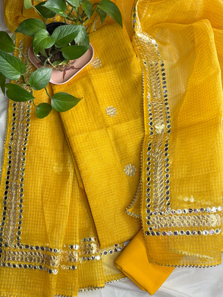 Hansa- Kota Salwar Suit In Gota Work In yellow, This Traditional Suits 2.5 Mtr Top In Kota ,2.5 Mtr Dupatta In Kota,2.5 Mtr Bottom In Cotton, Wear This Kota Doria Suit With Kundan Necklace And Jhumkas On Day Time Function, This Designer Suit Comes With Beautiful Dupatta That Seems Perfect For Any Occasion,Free Shipping And Cod Available, Shipping Worldwide.