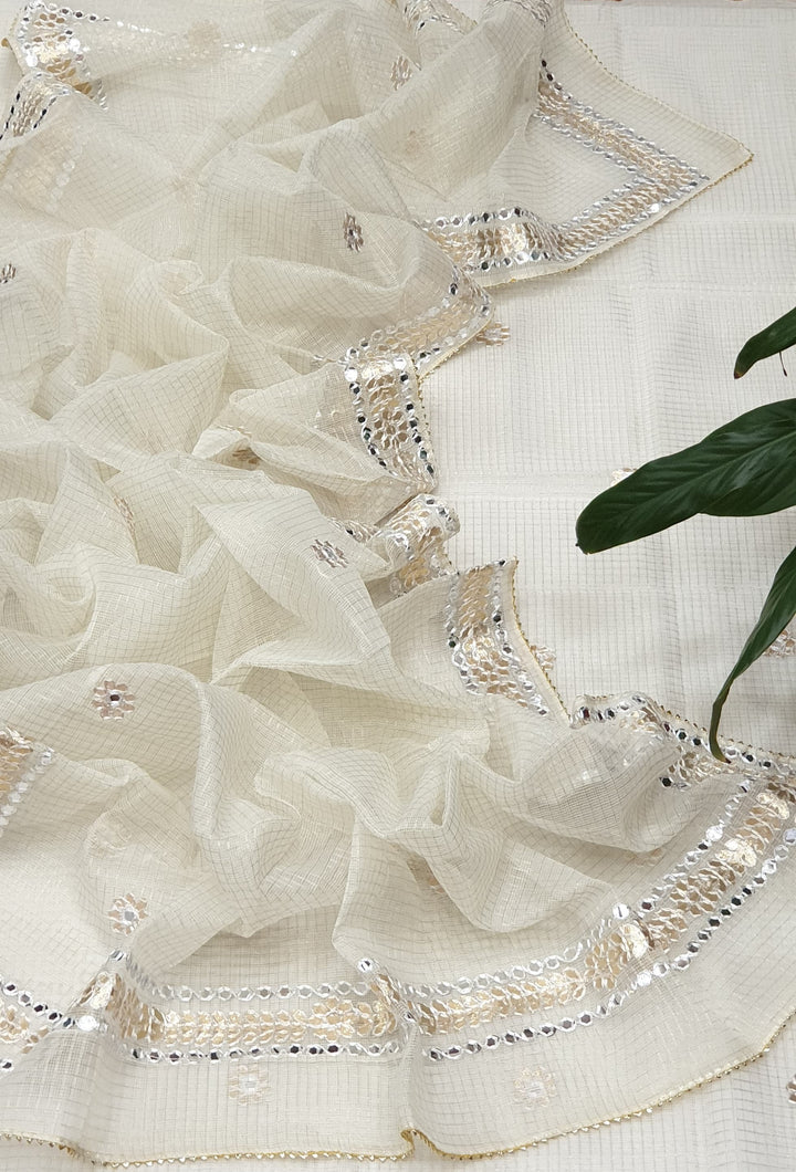 Mandira- Kota Salwar Suit In Gota Work In white , This Traditional Suits 2.5 Mtr Top In Kota ,2.5 Mtr Dupatta In Kota,2.5 Mtr Bottom In Cotton, Wear This Kota Doria Suit With Kundan Necklace And Jhumkas On Day Time Function, This Designer Suit Comes With Beautiful Dupatta That Seems Perfect For Any Occasion,Free Shipping And Cod Available, Shipping Worldwide.