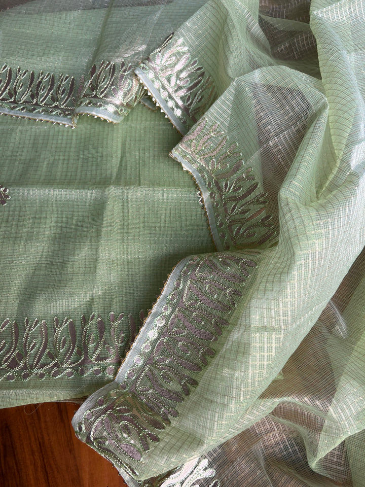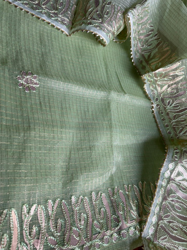Roopkala- Kota Salwar Suit In Gota Work In Pastel Green This Traditional Suits 2.5 Mtr Top In Kota ,2.5 Mtr Dupatta In Kota,2.5 Mtr Bottom In Cotton, Wear This Kota Doria Suit With Kundan Necklace And Jhumkas On Day Time Function, This Designer Suit Comes With Beautiful Dupatta That Seems Perfect For Any Occasion,Free Shipping And Cod Available, Shipping Worldwide.