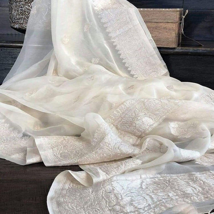 - Designer Pure White Jaal Banarasi Khaddi Georgette Saree