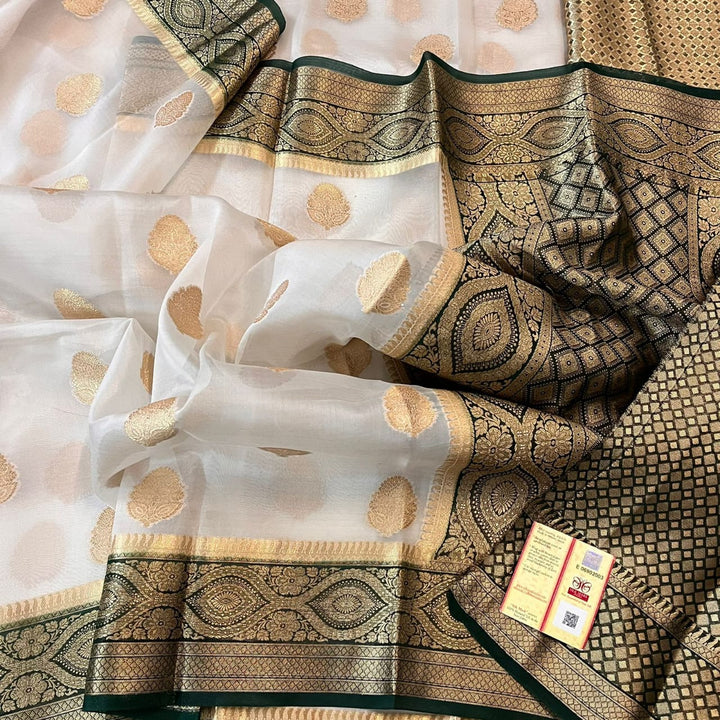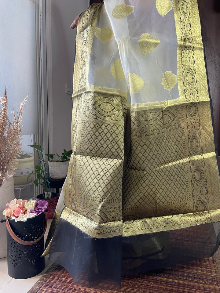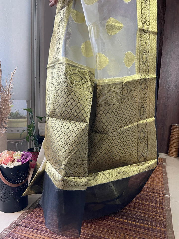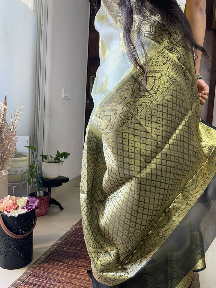 - Ethereal Trending Designer White Gold Banarasi Kora Organza Saree