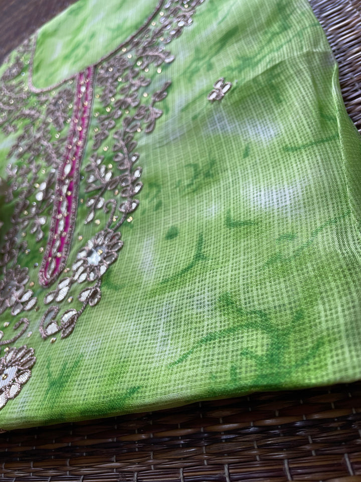A beautiful green shibori Gota Patti kurta with nice shade, is adorned with gota work on yoke. Wear this one with our palazzo or skirt along with our banarsi dupatta for a complete look. You may also want to match it with our Chikankari pants