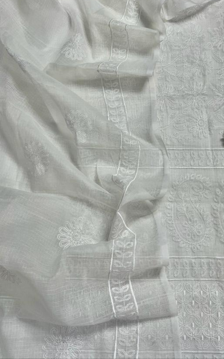 Rudraksha- White Embroided Cotton Kota Doria Suit Fabric With Dupatta (unstitched)