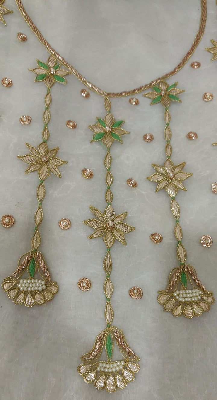 Grace Any Occasion With This Exquisite White Gota Patti Kurti. This White Gota Patti Kurti Is Crafted In Organza Fabric. Our Gorgeous Unstitched Kurti is Adorned With Beautiful Gota Patti Work On Neckline. This Unstitched Kurti Fabric Can Be Styled According To Your Design.