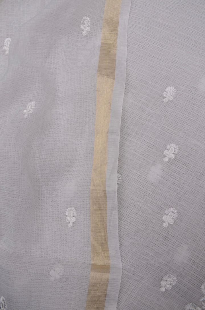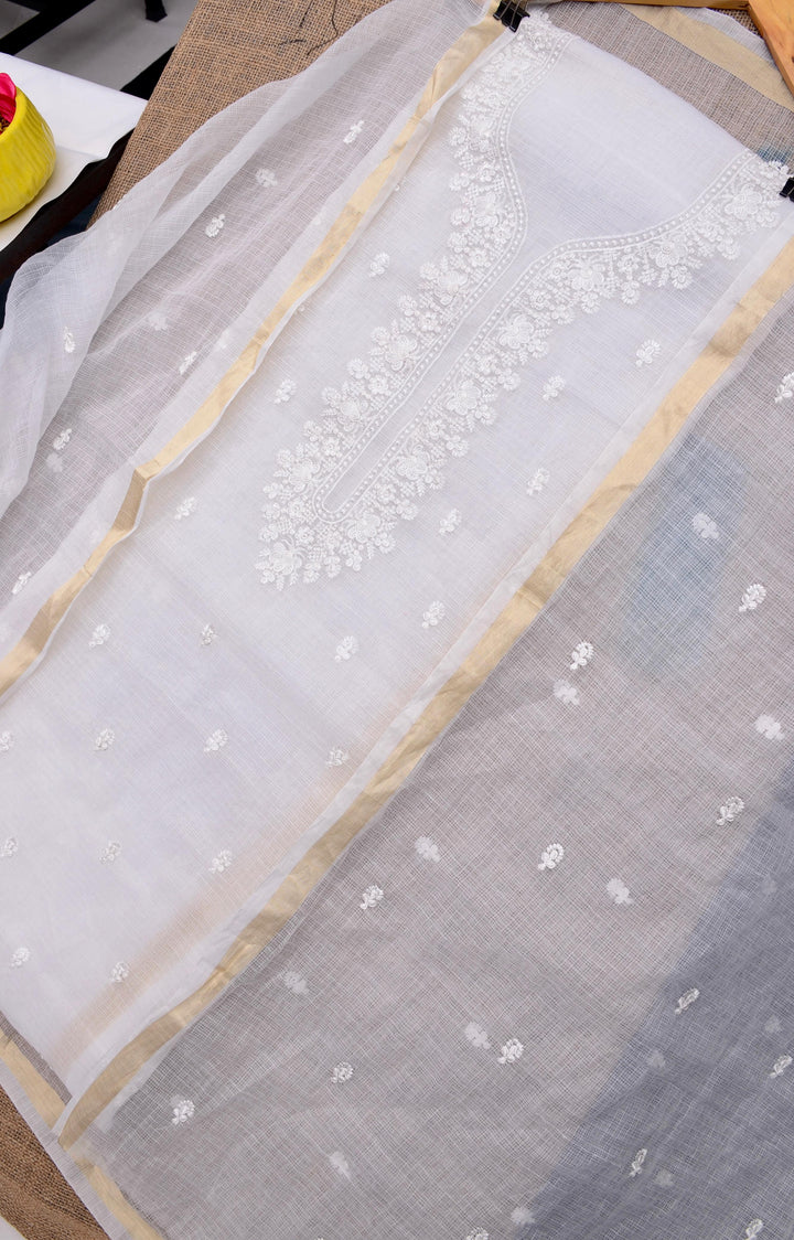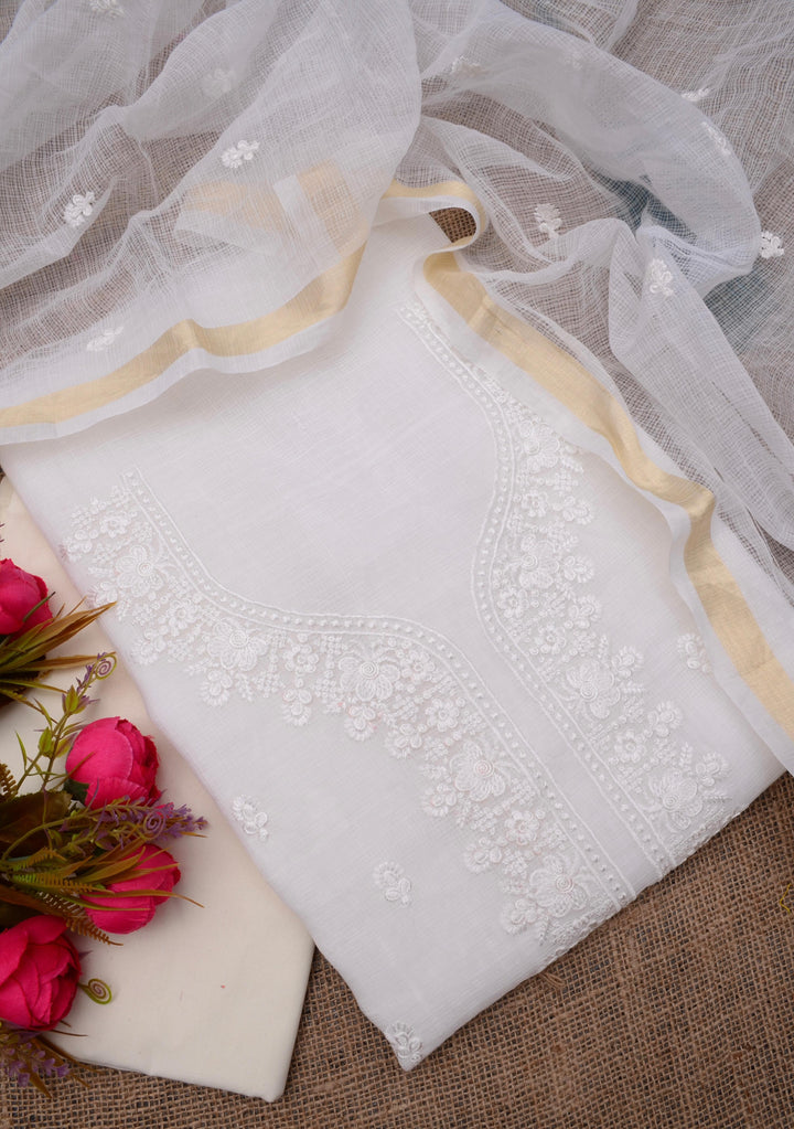 Brahmakamal- White Embroided Work Kota Doria Suit Fabric With Dupatta (unstitched)