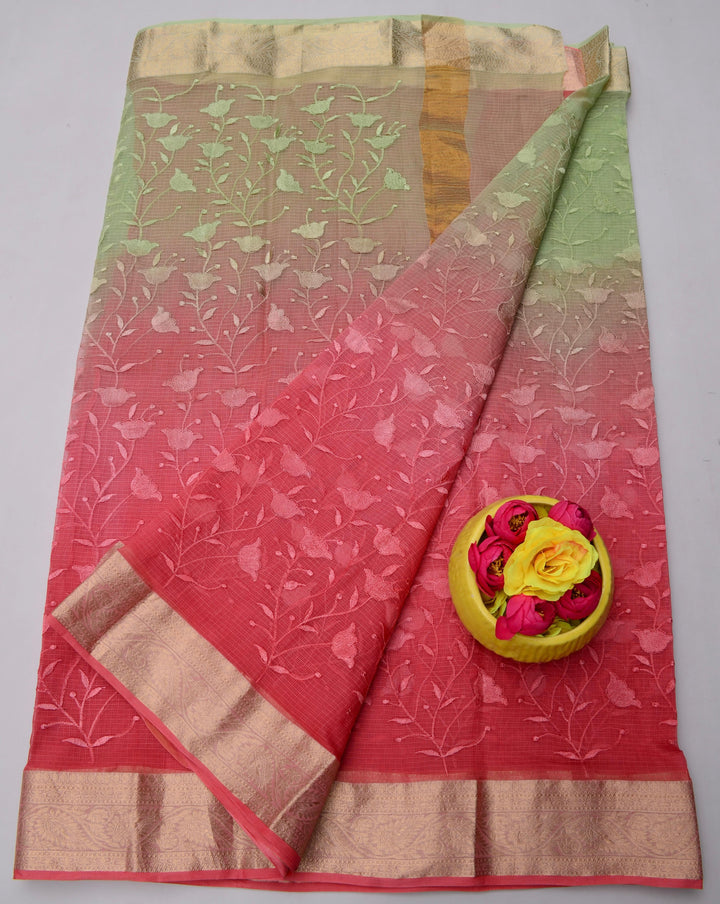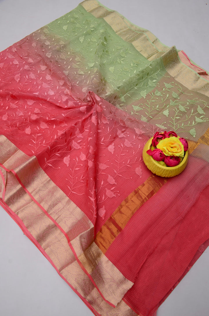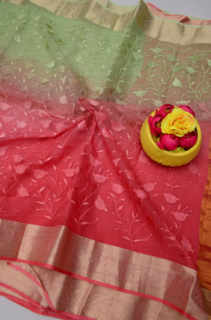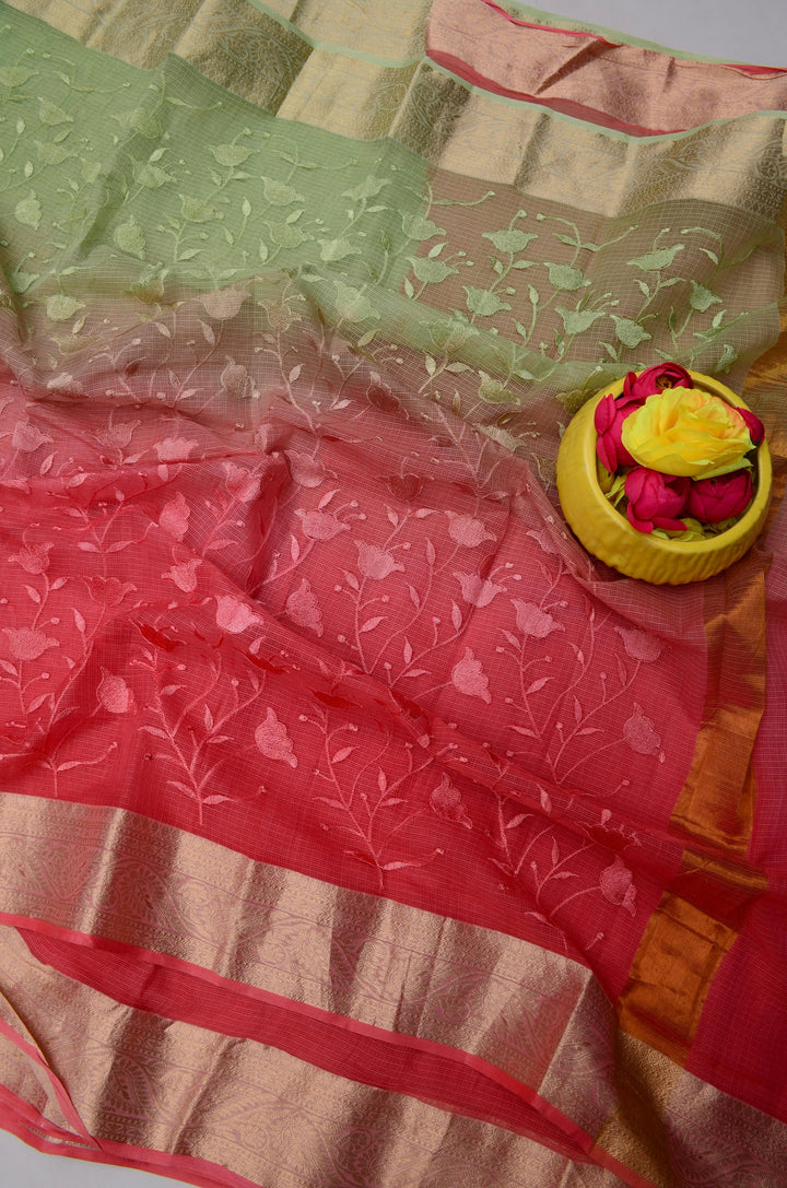 Piyari- Green and Red Kota Doria All Over Embroidery Work Saree, This Kota Doria Saree In Cotton Comes With Blouse.Wear This Kota Doria Saree as Office Wear Saree, Daily Wear Saree Or Kitty Party Saree. Saree Length - 6.5 Mtr With Blouse.