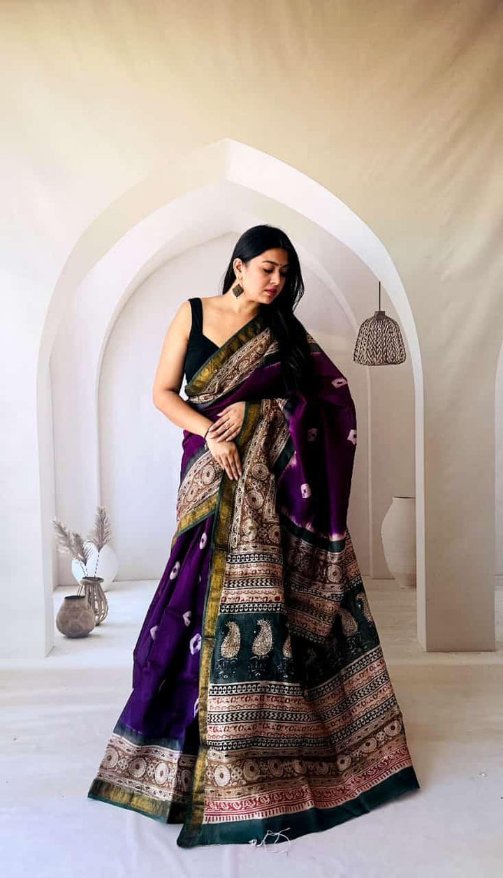 Dark Purple Maheshwari Silk Bagru Hand Block Print Saree