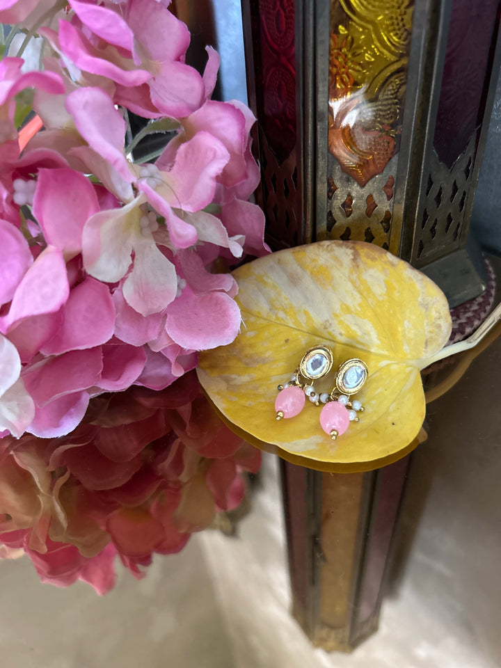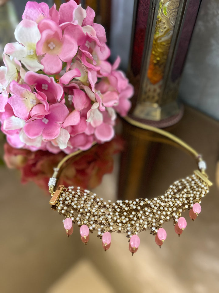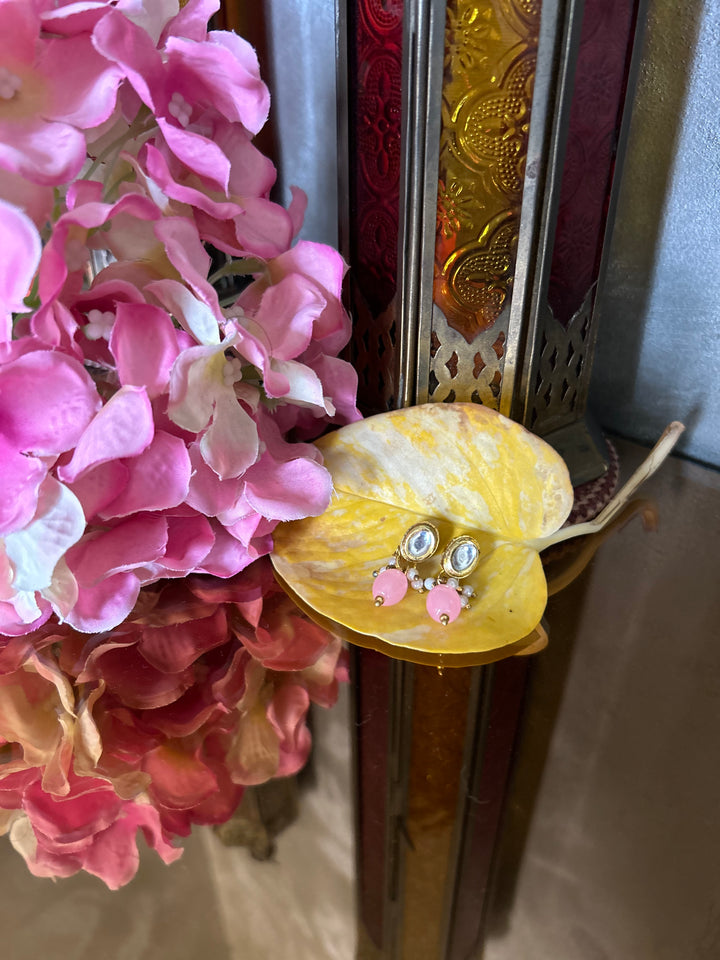 Elegant Pearl necklace with hanging pink Pearl comes with designer matching earrings.
