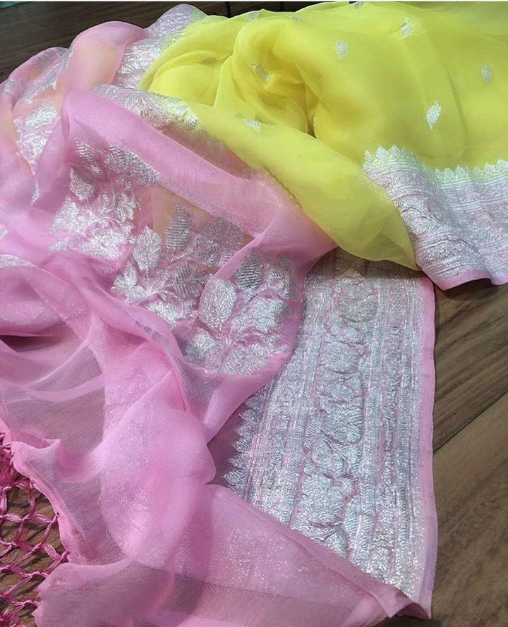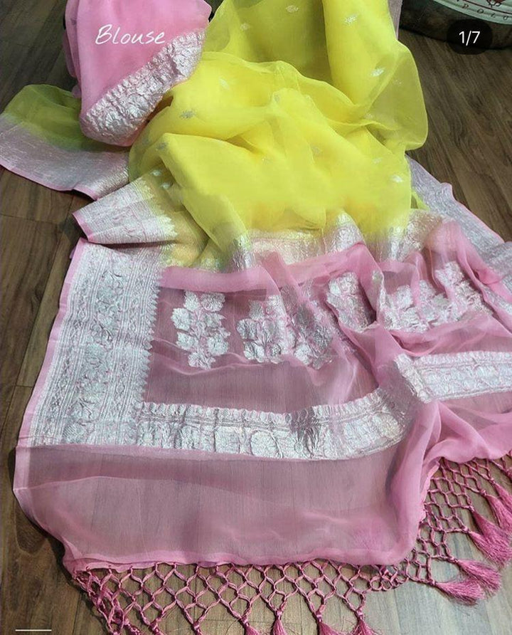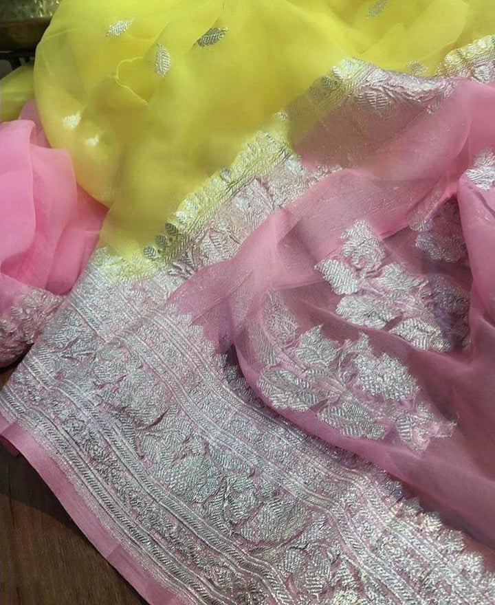 Light Pink-Yellow Banarasi Khaddi Jaal Georgette Saree