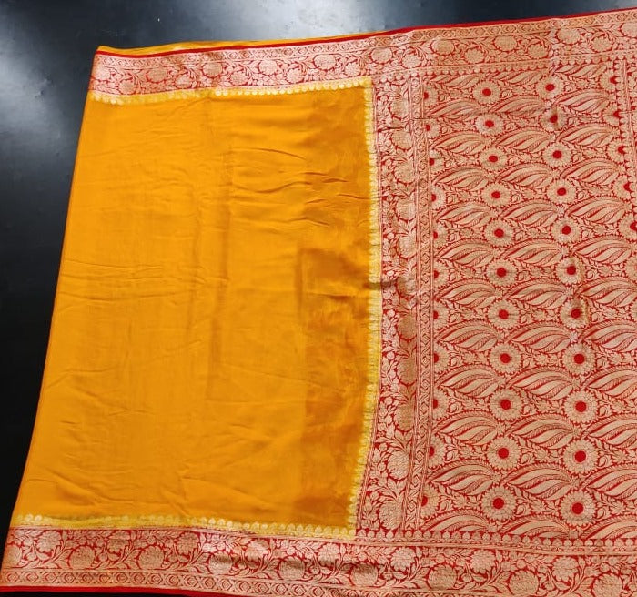 - Orange-Red Handloom Banarasi Khaddi Chiffon Meenakari Saree