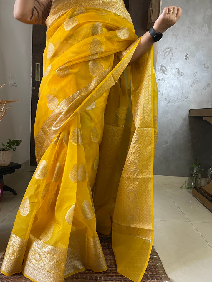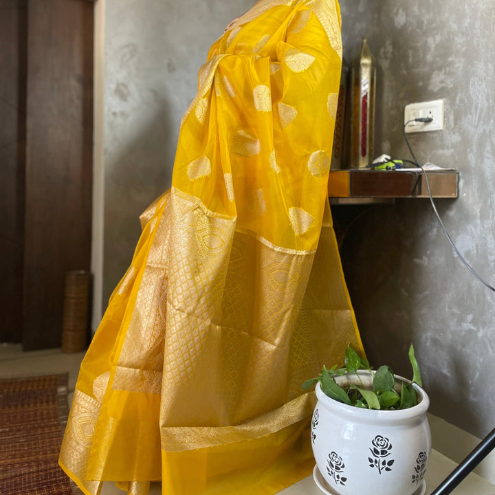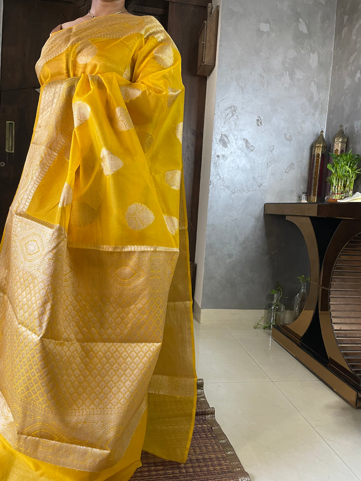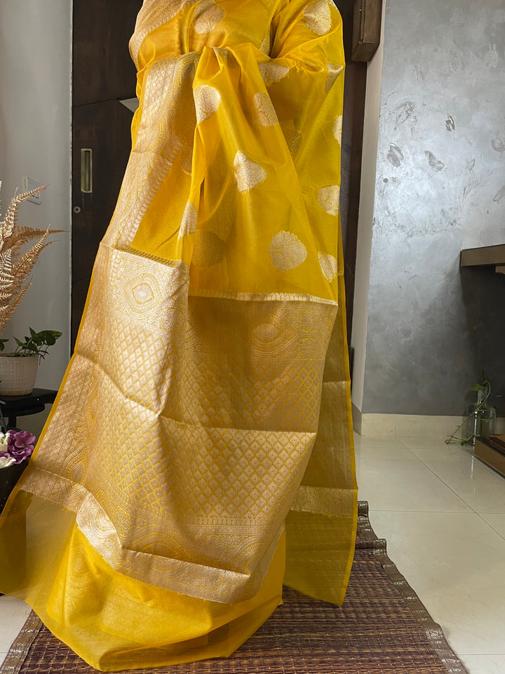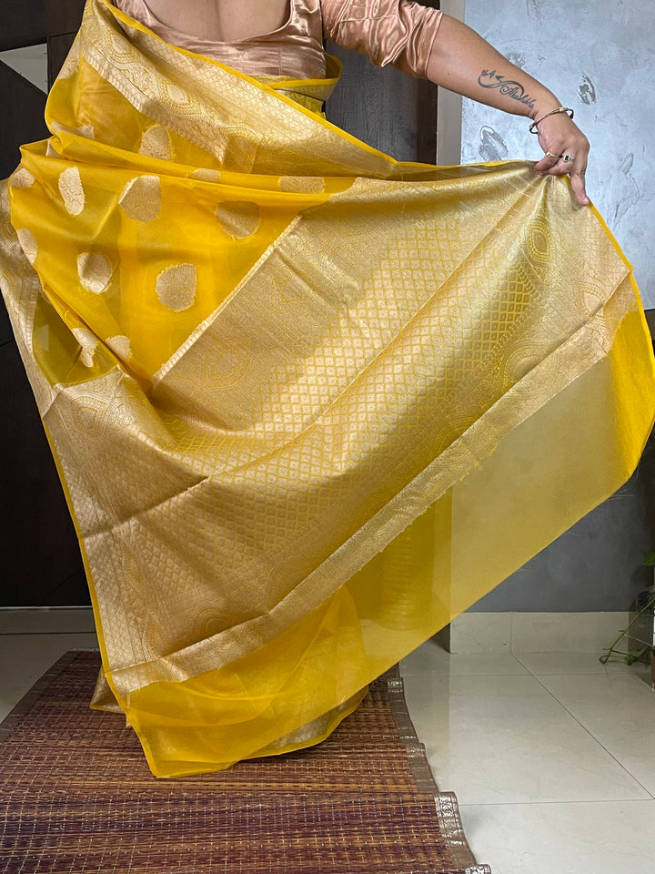 - Wedding Mustard Yellow Banarasi Kora Organza Saree