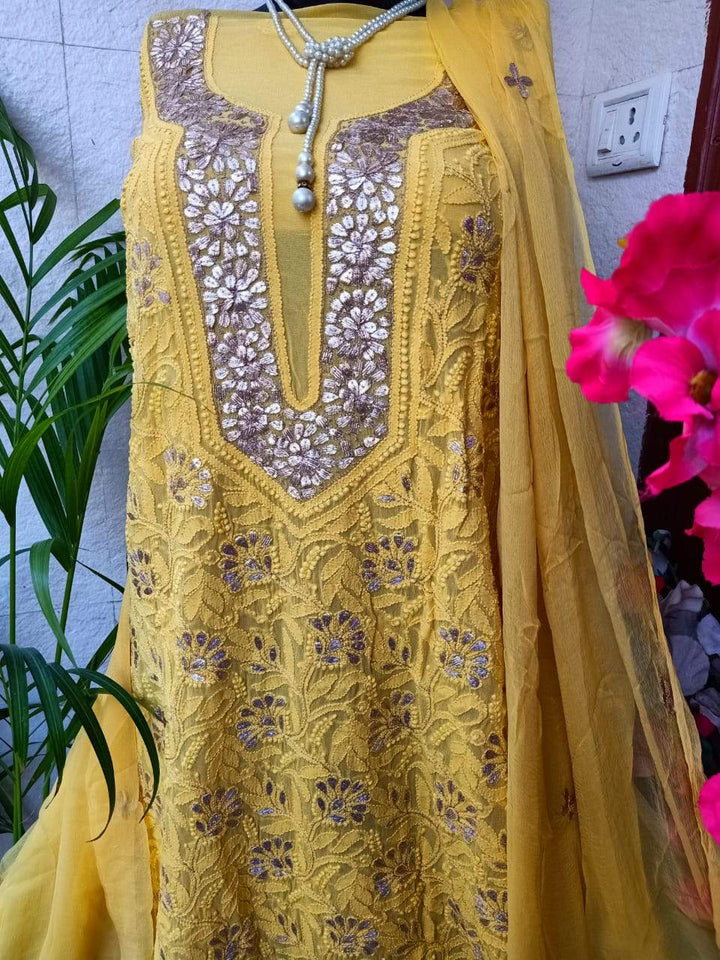 - Roohi – Gorgeous Yellow Lucknowi Chinkari Gota Patti Salwar Suit Fabric