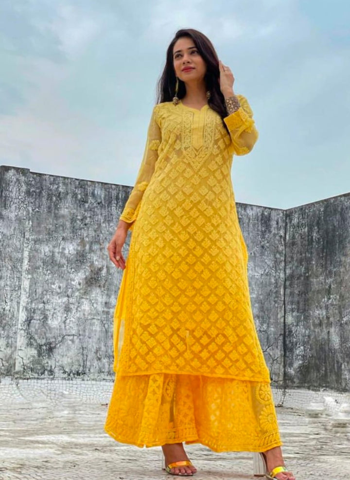 This Beautiful Sharara Set In Yellow Is An Ideal Outfit For Intimate Events And Wedding Festivities Like Haldi. Adorned With Beautiful Chikankari Work All Over Makes It Perfect For All Your Special Occasions. It Is Paired With Matching Sharara Pants And A Dupatta.