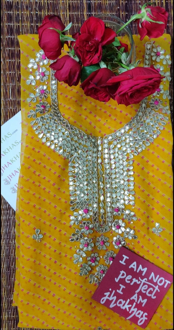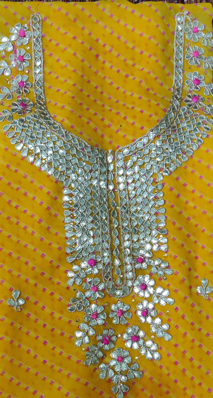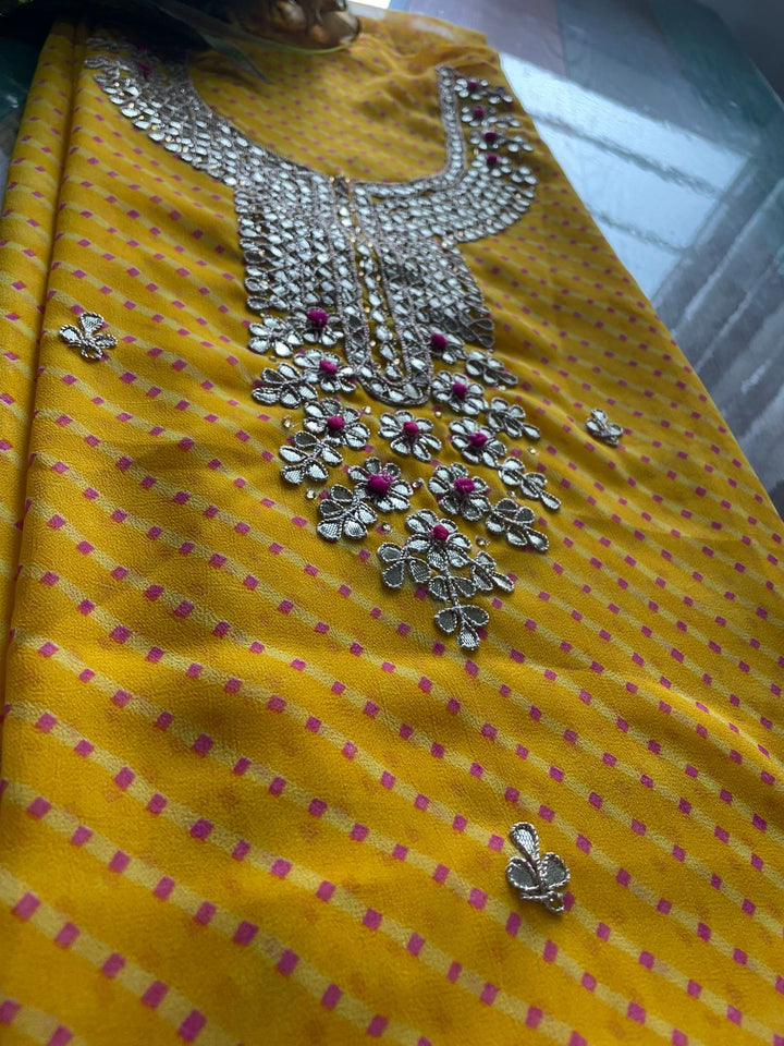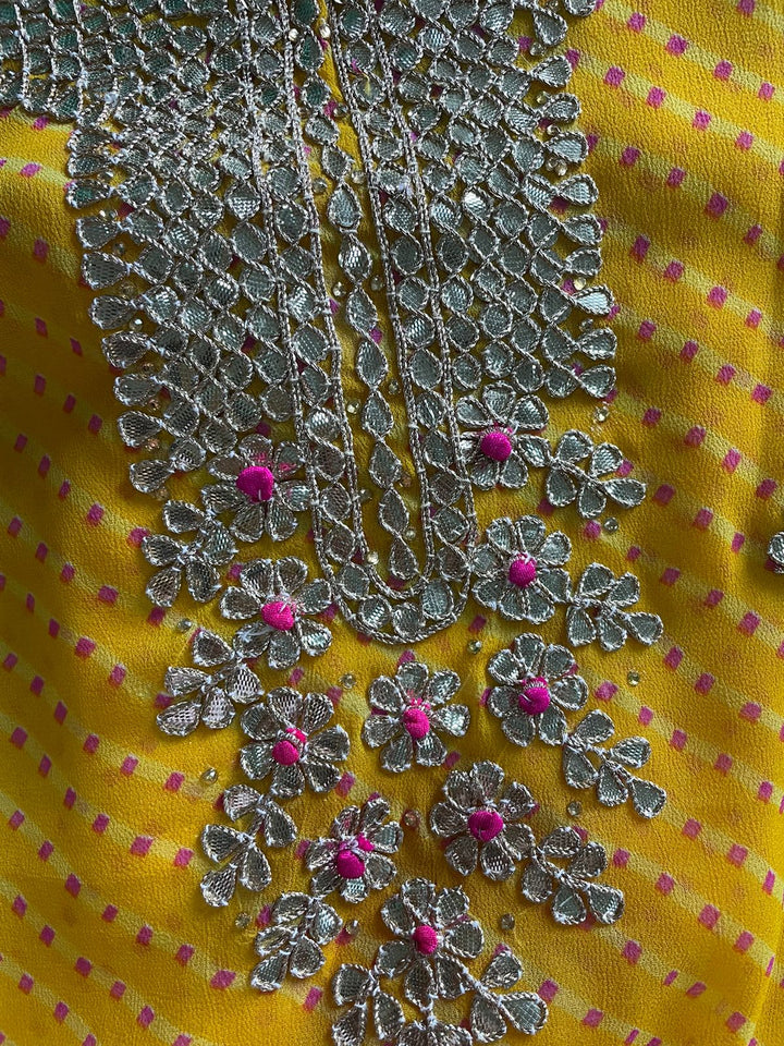 Add A Touch Of Charm To Your Ethnic Wear By Wearing This Yellow Gota Patti Georgette Kurti. A Wardrobe Essential And Also The Perfect Kutri For Flaunting Stylish Elegance During Festive Season. This Yellow Georgette Kurti is Adorned With Heavy Gota Patti Work On Neckline And Lehariya Design All Over. You Can Get It Customized And Styled According To Your Design.