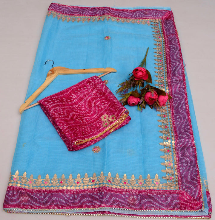 Nilam- Blue Kota Doria Gota Patti Saree Comes With Blouse. The Saree Comes With Designer Gota Patti Work On Border And Boota. Wear This Kota Doria Saree as Casual Meeting Saree Or Kitty Party Saree. Saree Length - 6.5 Mtr With Blouse.