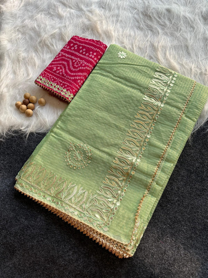 Anoli- Pista Green Kota Doria Gota Patti Saree Comes With Blouse. The Saree Comes With Designer Gota Patti Work On Border And Boota. Wear This Kota Doria Saree as Casual Meeting Saree Or Kitty Party Saree. Saree Length - 6.5 Mtr With Blouse.