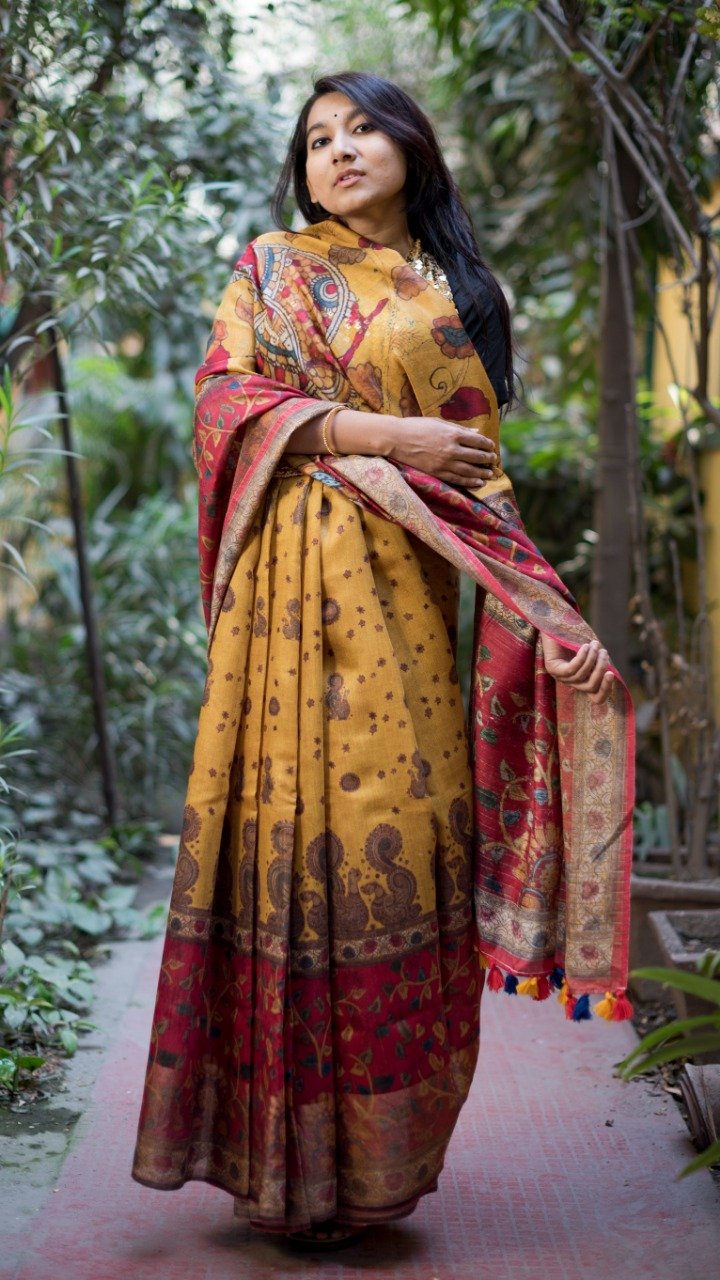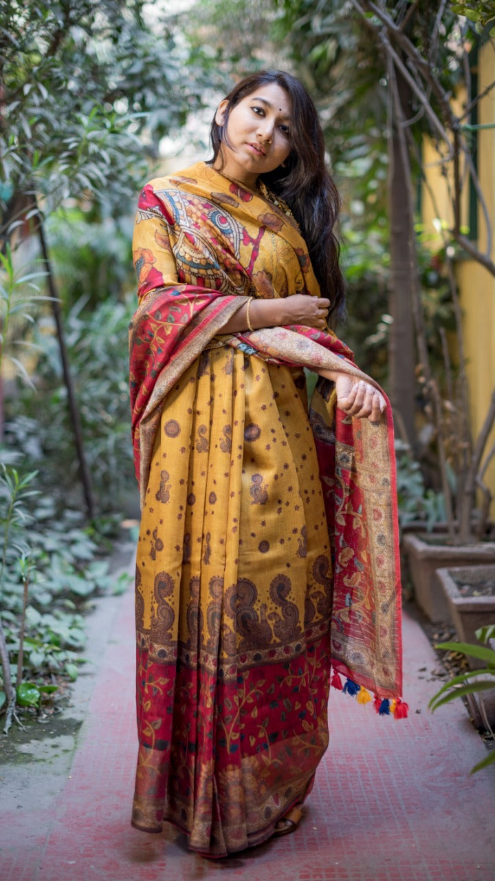 Pure Linen Saree Are Always In Fashion Because Of Their Elegant Look And Soft Fabric. These Sarees Are Easy To Drape And Light To Carry. This Linen Saree Has Beautiful Shades Of Yellow Adorned With Beautiful Print All Over, And Tassels on Pallu Adds To It Charm. Our Linen Saree Comes With A Matching Blouse Which Can Be Stitched As Per Your Size And Style.